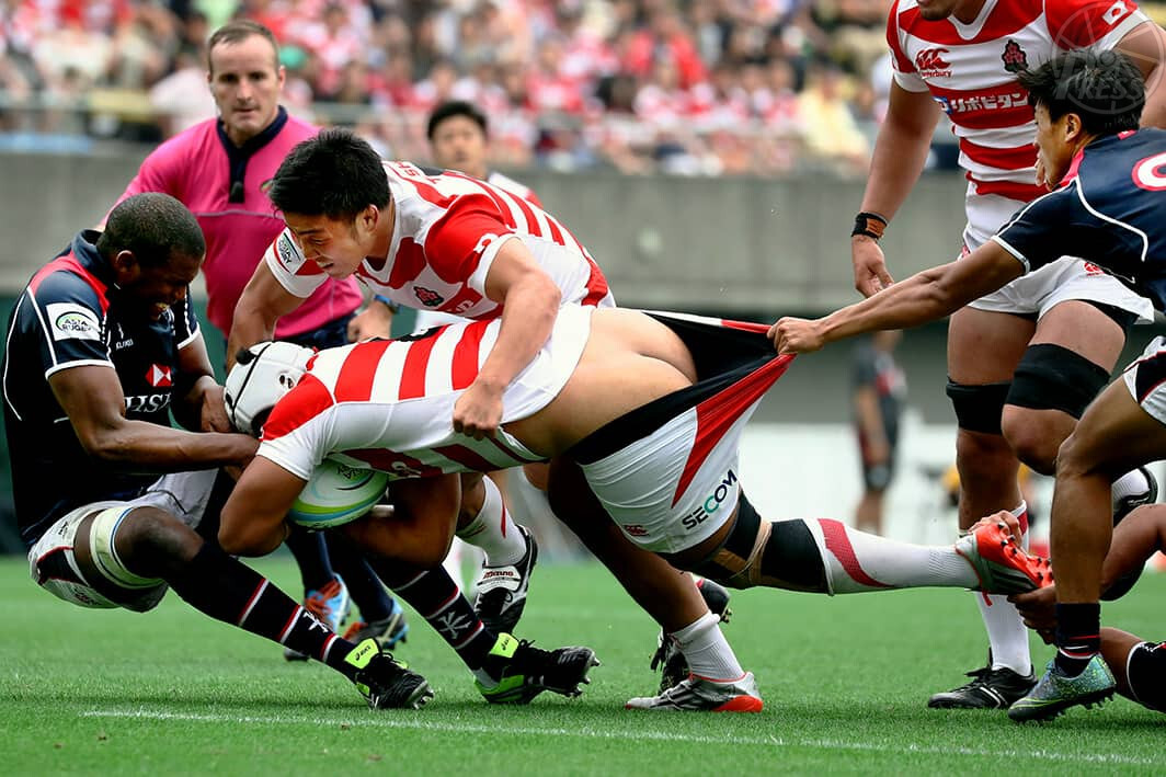 ラグビーアジア選手権でパンツを引っ張られながらも、さらに突進する日本代表NO8デビタ・タタフ