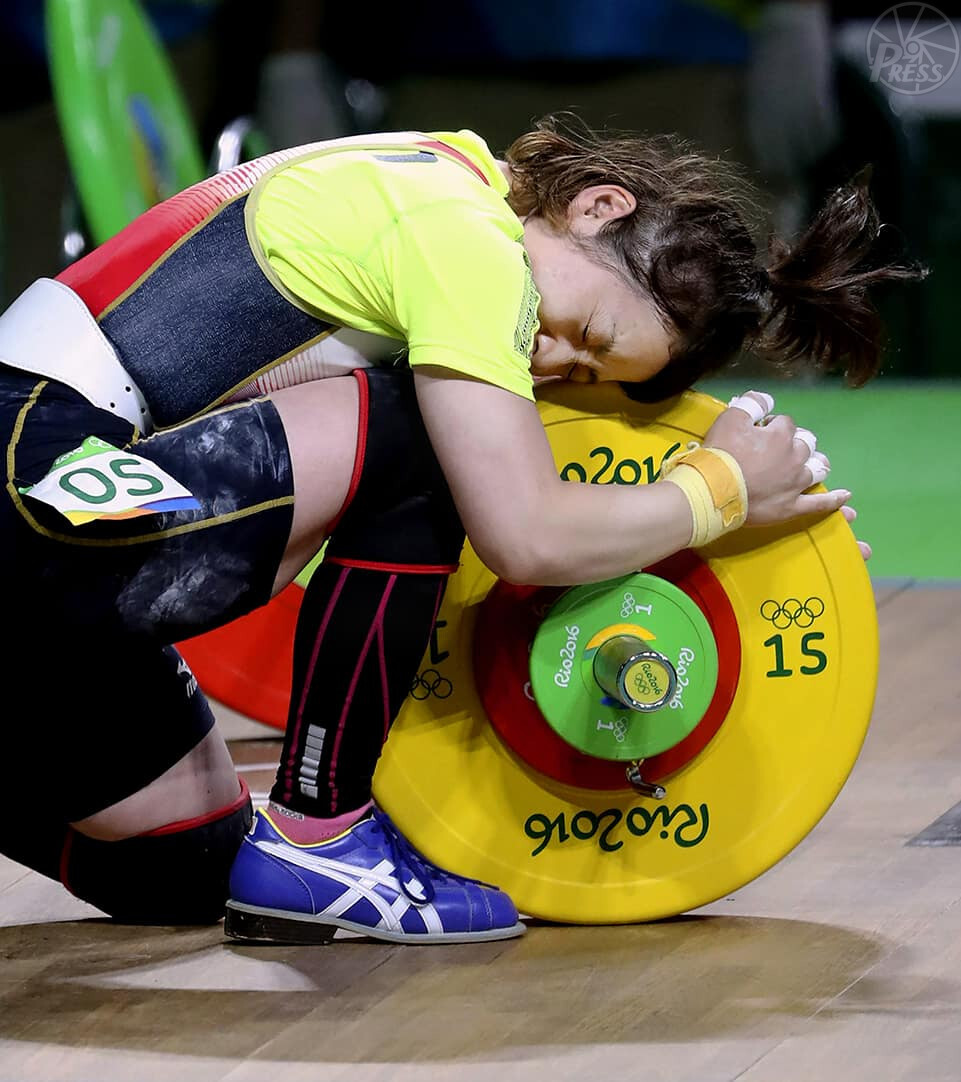 リオ五輪重量挙げ女子48キロ級で逆転して銅メダルを獲得、三宅宏美は感謝をこめてバーベルに抱きついた