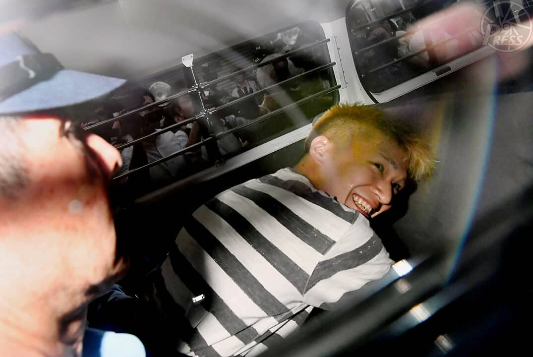 送検のため津久井署を出る車の中で笑みを浮かべる植松聖容疑者(7月27日)