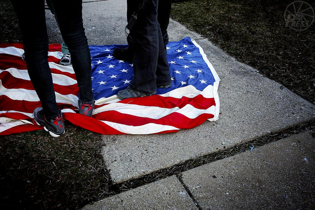 黒人男性らに踏みつけられた星条旗。「国を侮辱するのか」と白人男性の怒号が飛んだ。