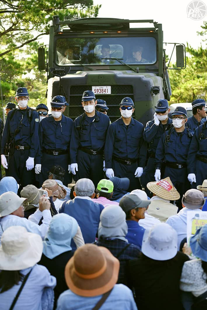米軍用ヘリコプター離発着帯建設現場近くで訓練場に入る米軍車両(後方)の前に座り込む人たちと対峙する機動隊員(10月26日 沖縄県東村