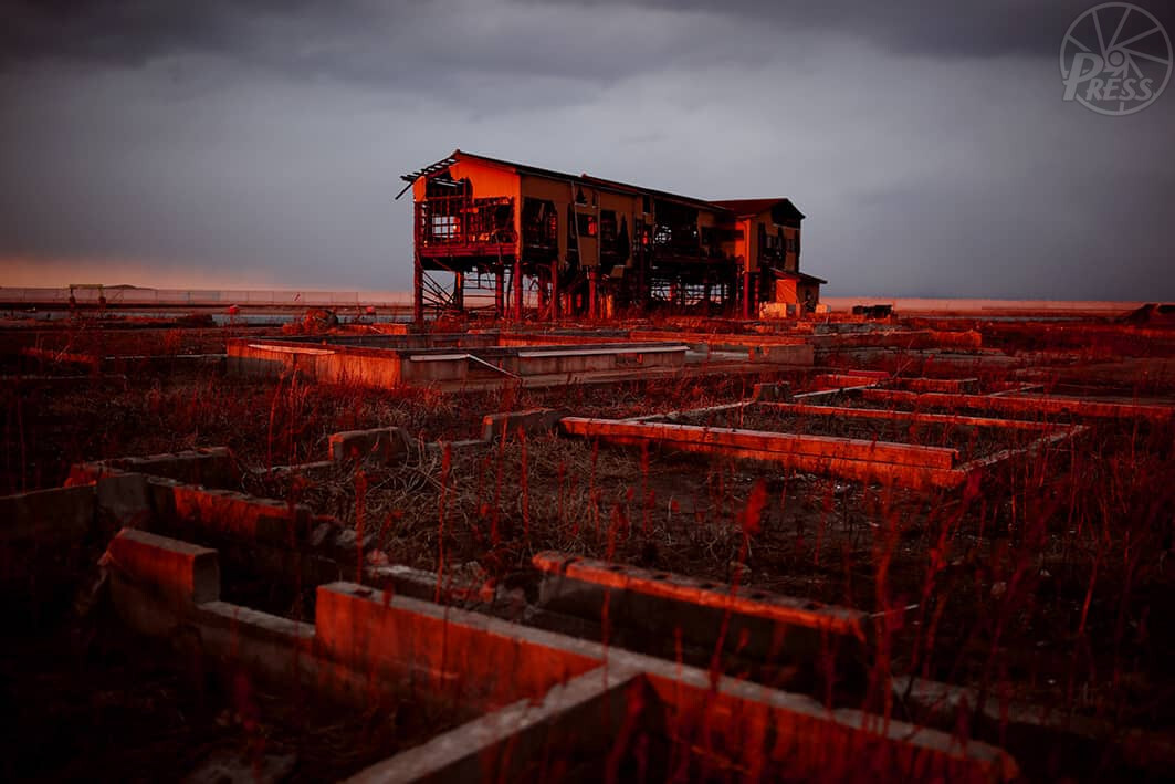 基礎だけが残った住宅跡や鉄骨がむき出しになった食堂が夕日に染まる(2月26日 福島県浪江町)