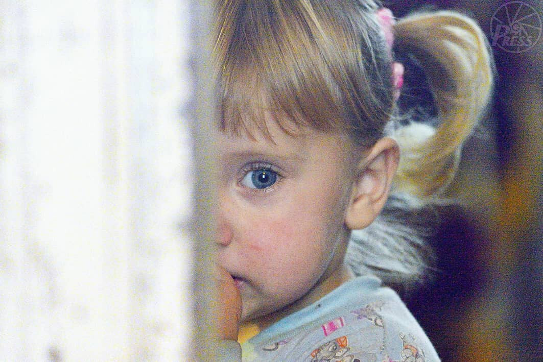 原発から50キロ離れた村で暮らすりーヤちゃん(2つ)が柱の陰から不安そうな顔を見せた。(11月22日)