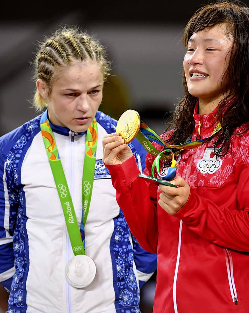 悔しさをにじませ登坂絵莉(右)の金メダルを見つめるアゼルバイジャンのマリア・スタドニク (8月17日)