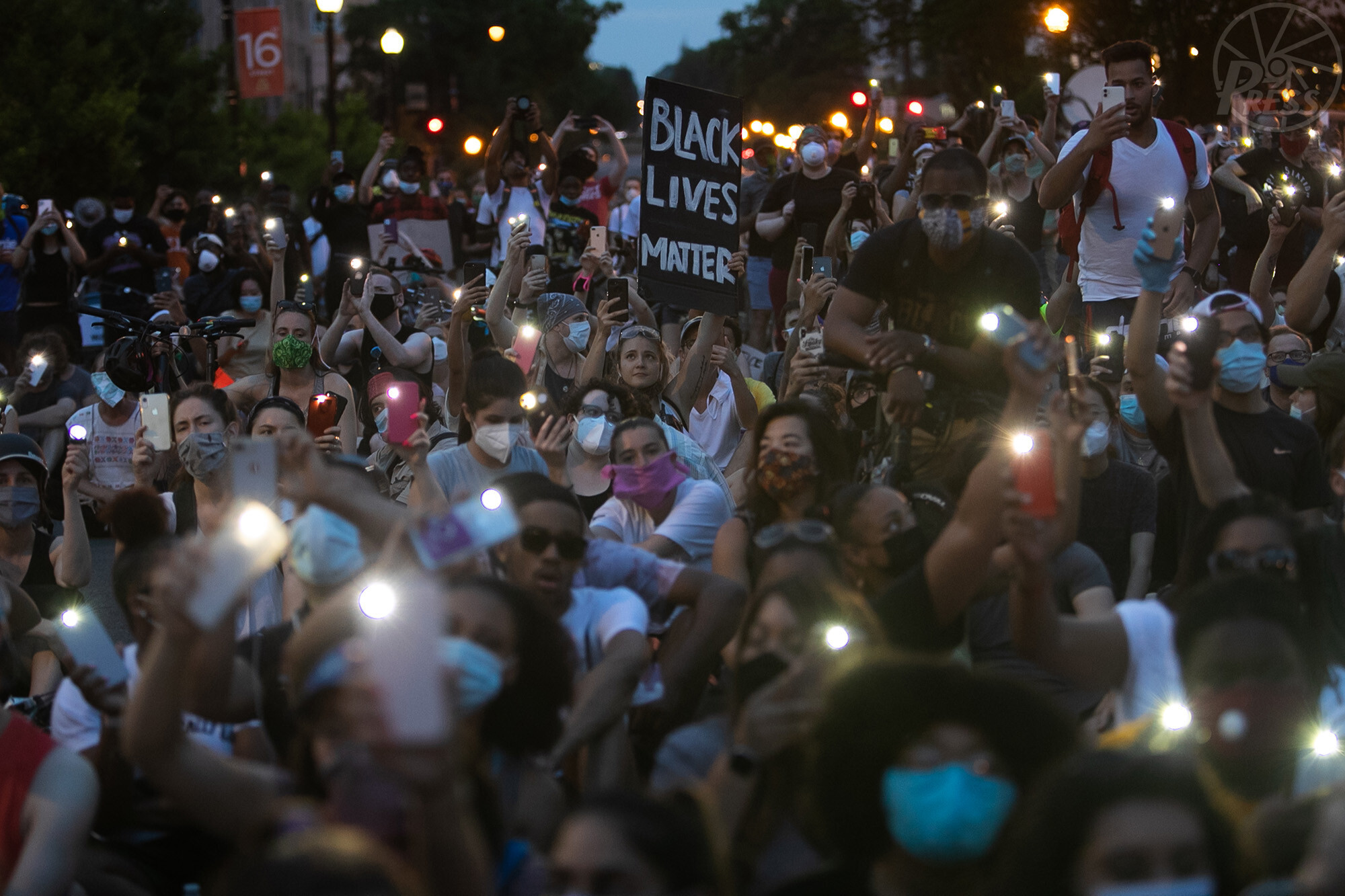 ホワイトハウスに向かって携帯電話をかざし「リーン・オン・ミー」を合唱し抗議する人たち(米ワシントン 6月3日)