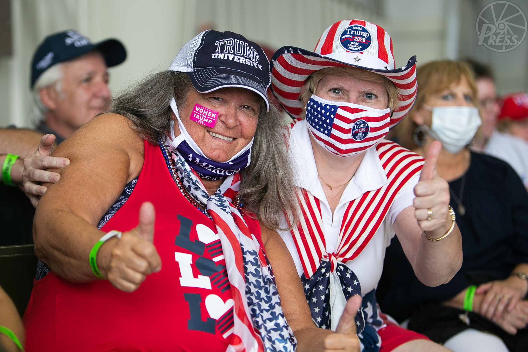 星条旗のデザインを身に包みトランプ大統領の選挙集会にやってきた女性たち(米ペンシルベニア州ラトローブ 9月3日)