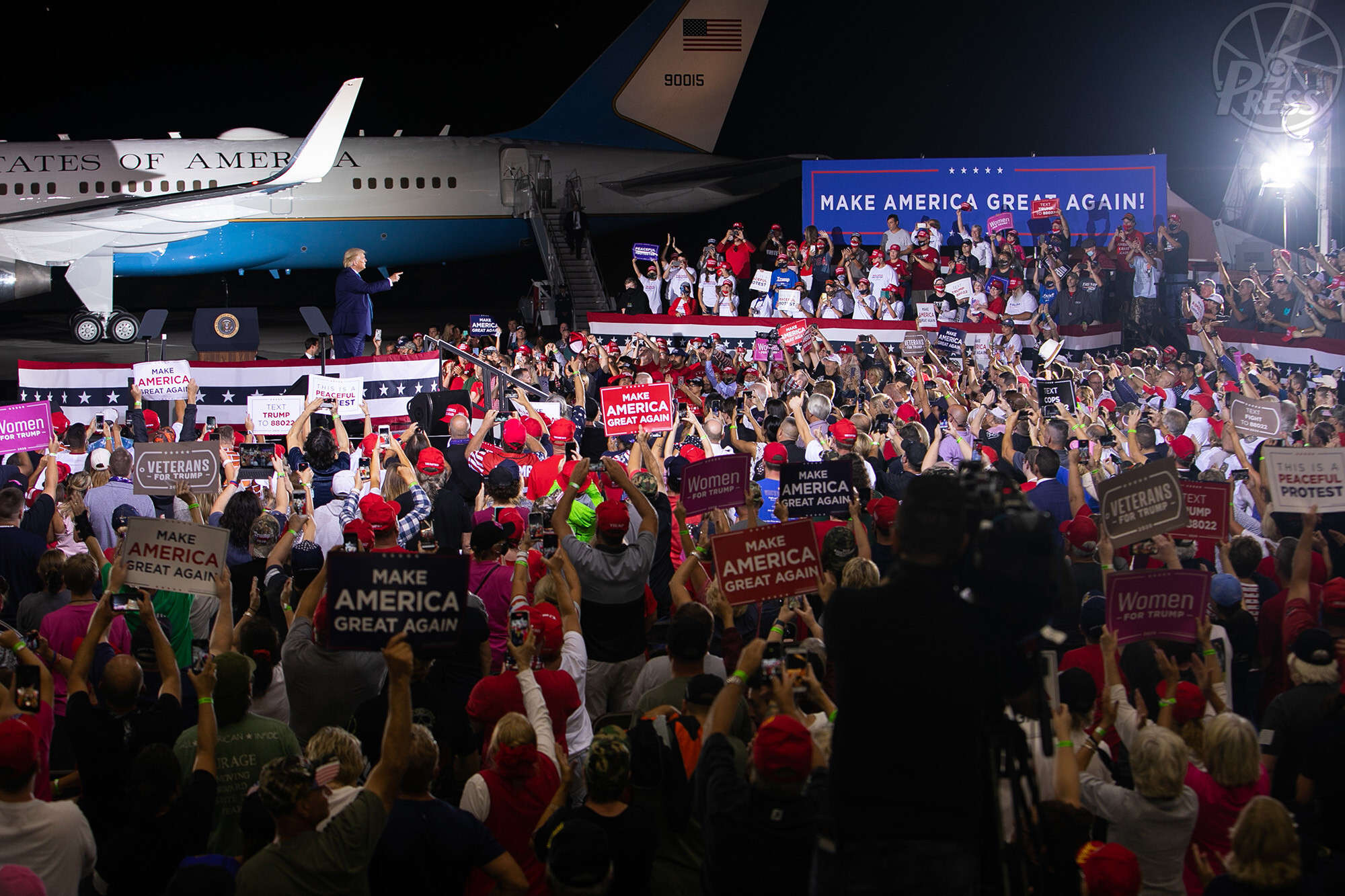 選挙集会で大統領専用機をバックに演説するトランプ米大統領(米ペンシルベニア州ラトローブ 9月3日)