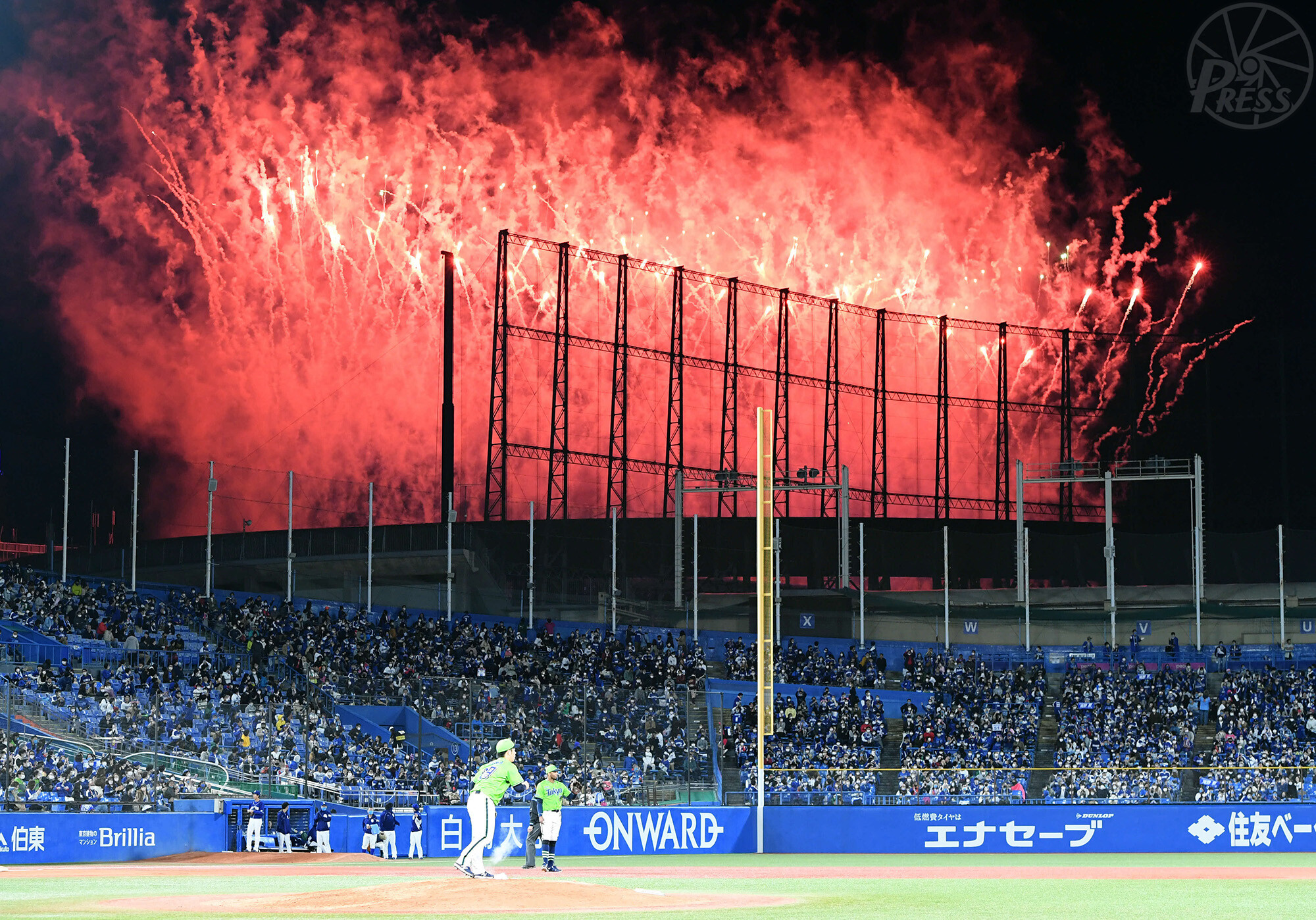 ヤクルト―中日戦の試合中に突然、国立競技場から大きな花火が上がった。あたかも真っ赤に燃えているように見えた。あまりの激しさに、試合が一時中断した。人気アイドルグループのライブ収録の演出だった(神宮球場 10月24日)