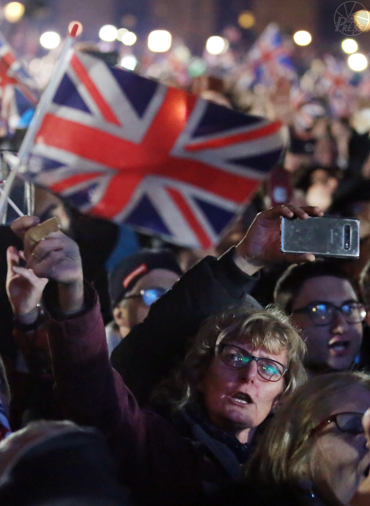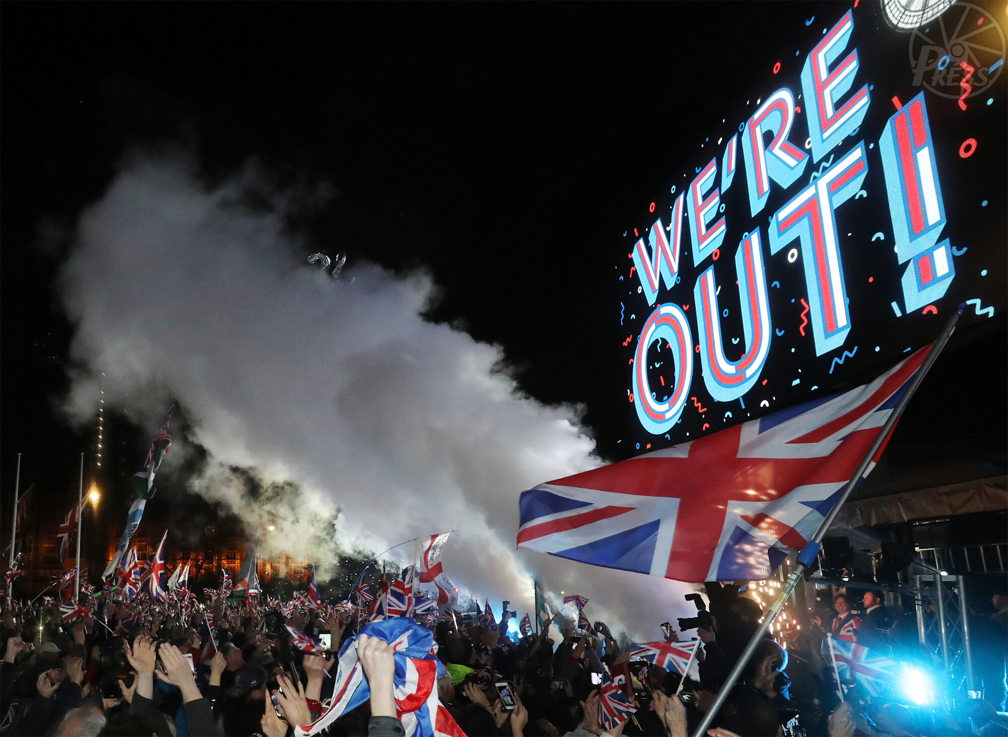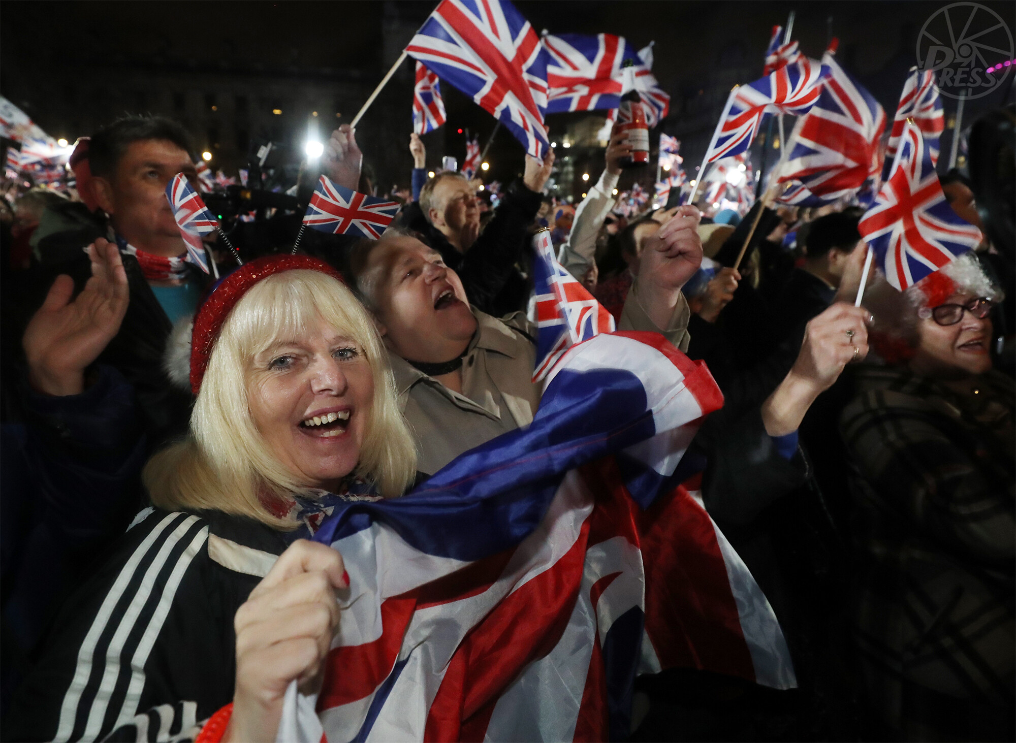 英国旗「ユニオンジャック」を手に議会前広場を埋め尽くす人たち(いずれもロンドン 1月31日午後11時)
