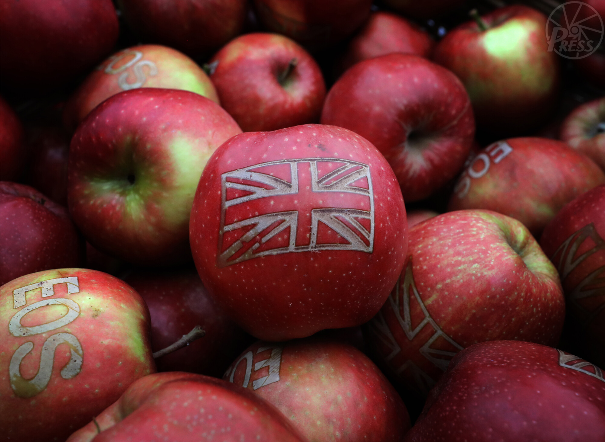 EU離脱を祝福するため無料で配られたリンゴ。英国国旗が刻まれていた(同日午前10時11分)