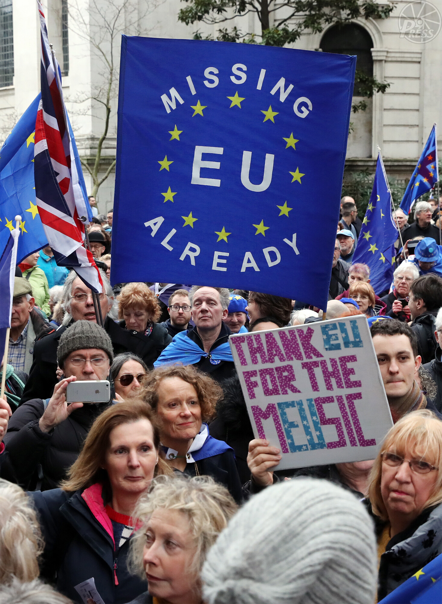 離脱を惜しみ欧州議会ロンドン事務所前に集まった残留派の人たち(同日午後3時28分)