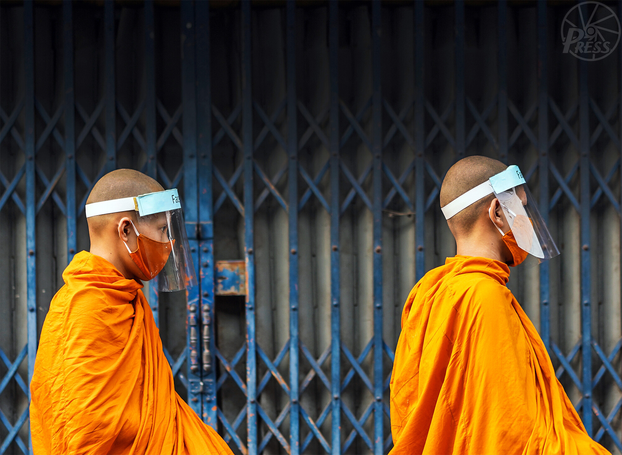 自作の防護マスクをつけ、一定の距離をあけて歩く僧侶(いずれもバンコク 4月7日)