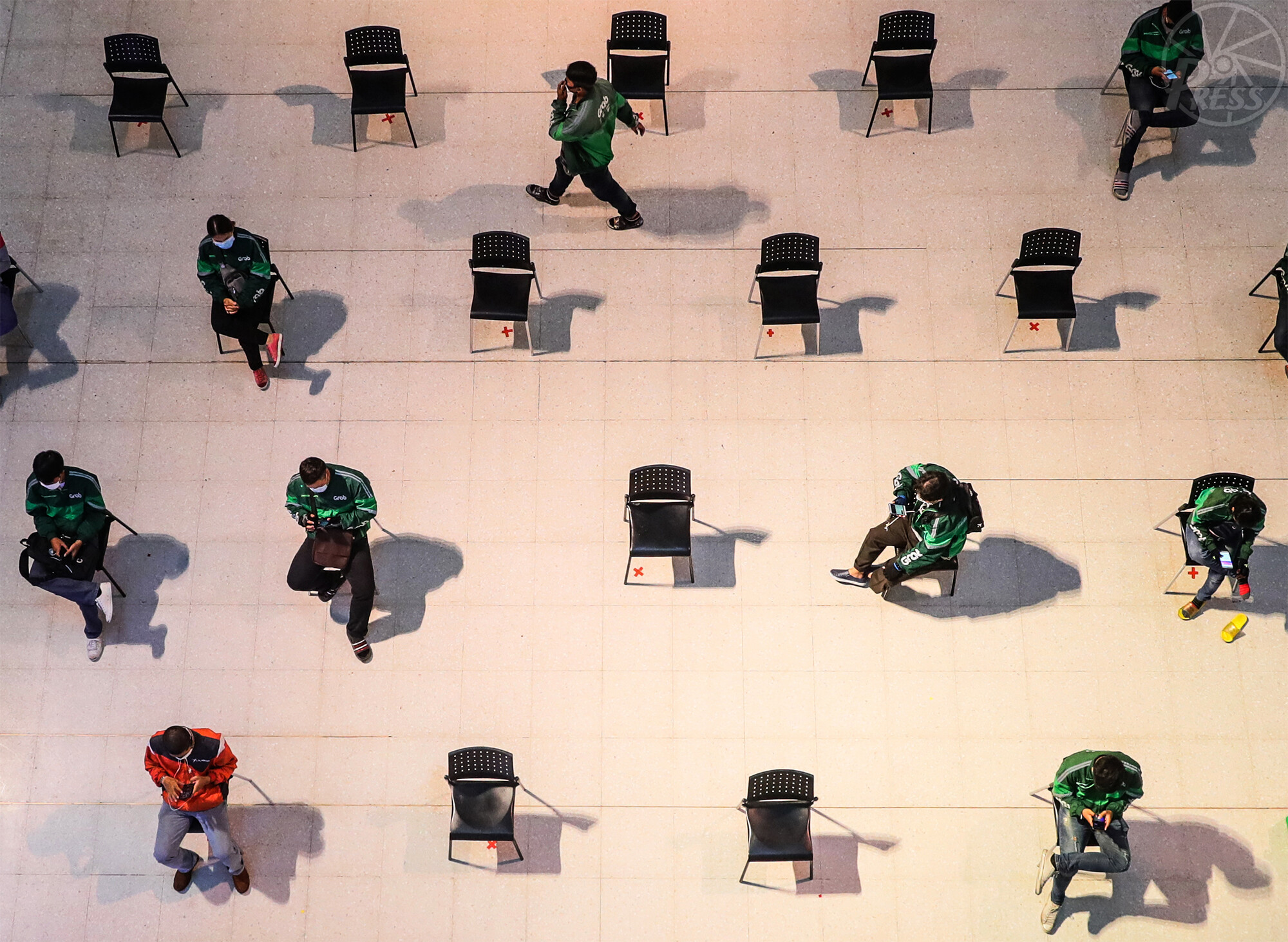 商業施設でお互いに距離をあけて待機する宅配の配達員(3月24日)