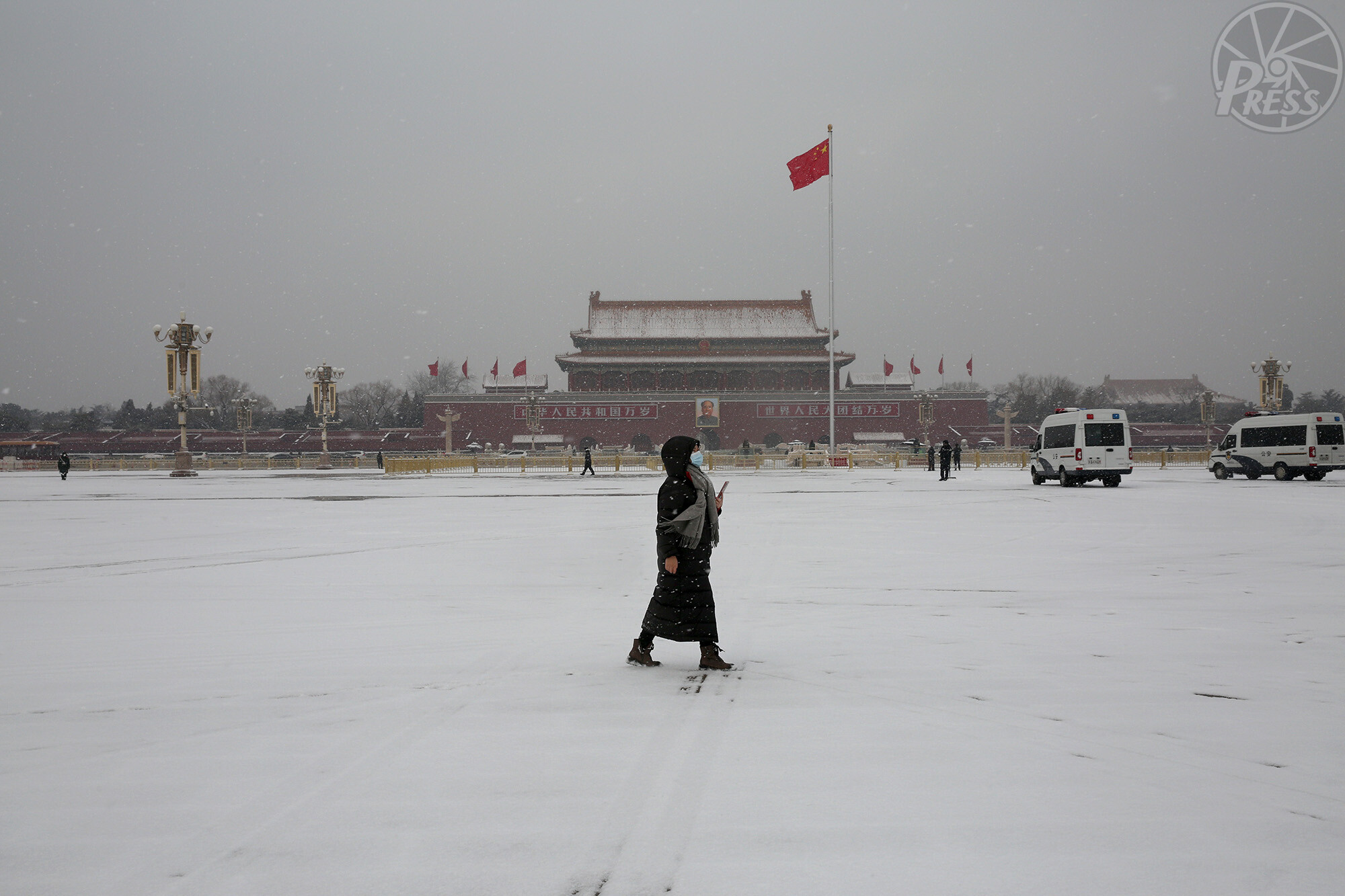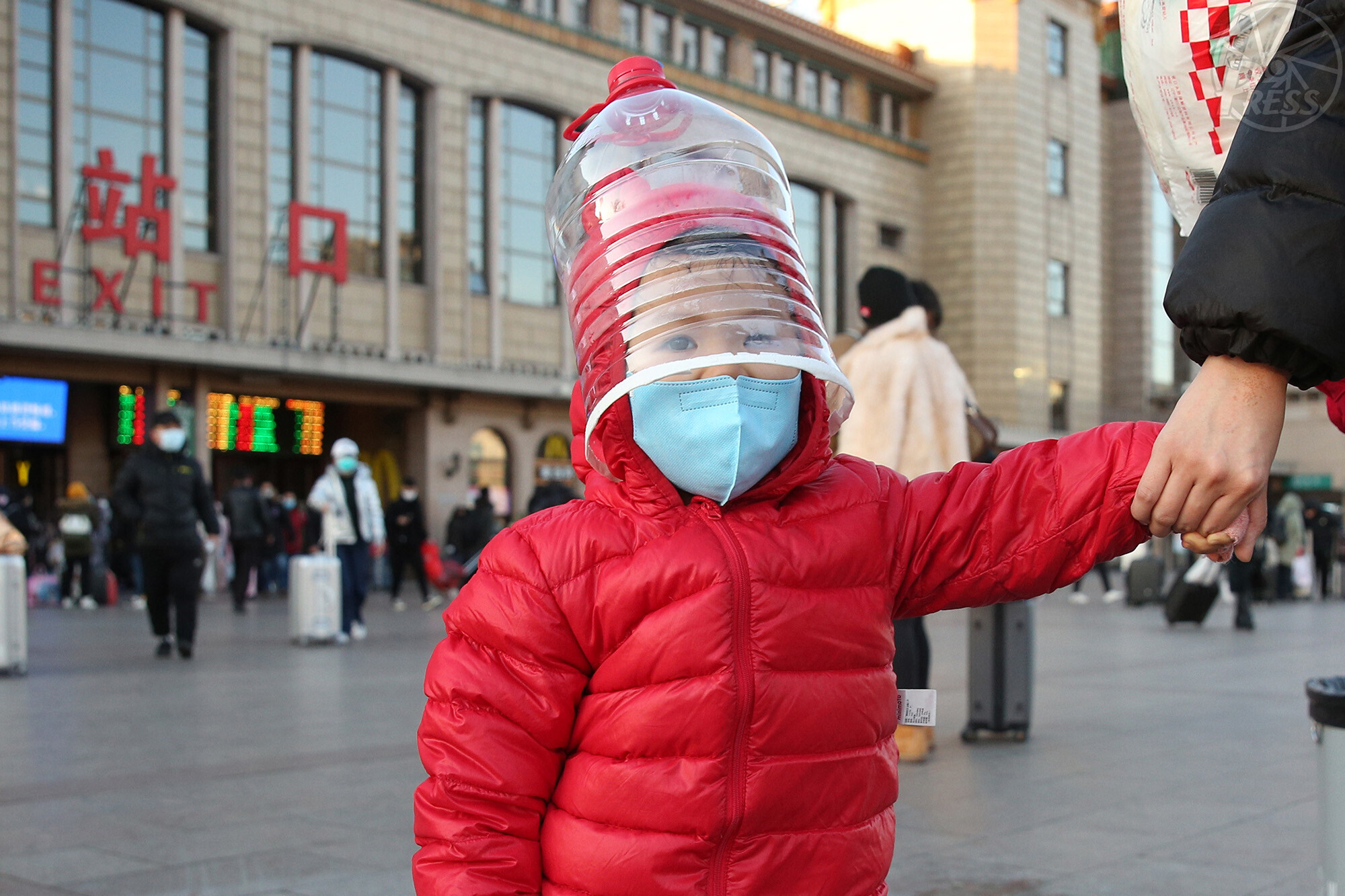 2月1日、北京駅前には、親が作ったペットボトルマスクをかぶった子どもがいた。