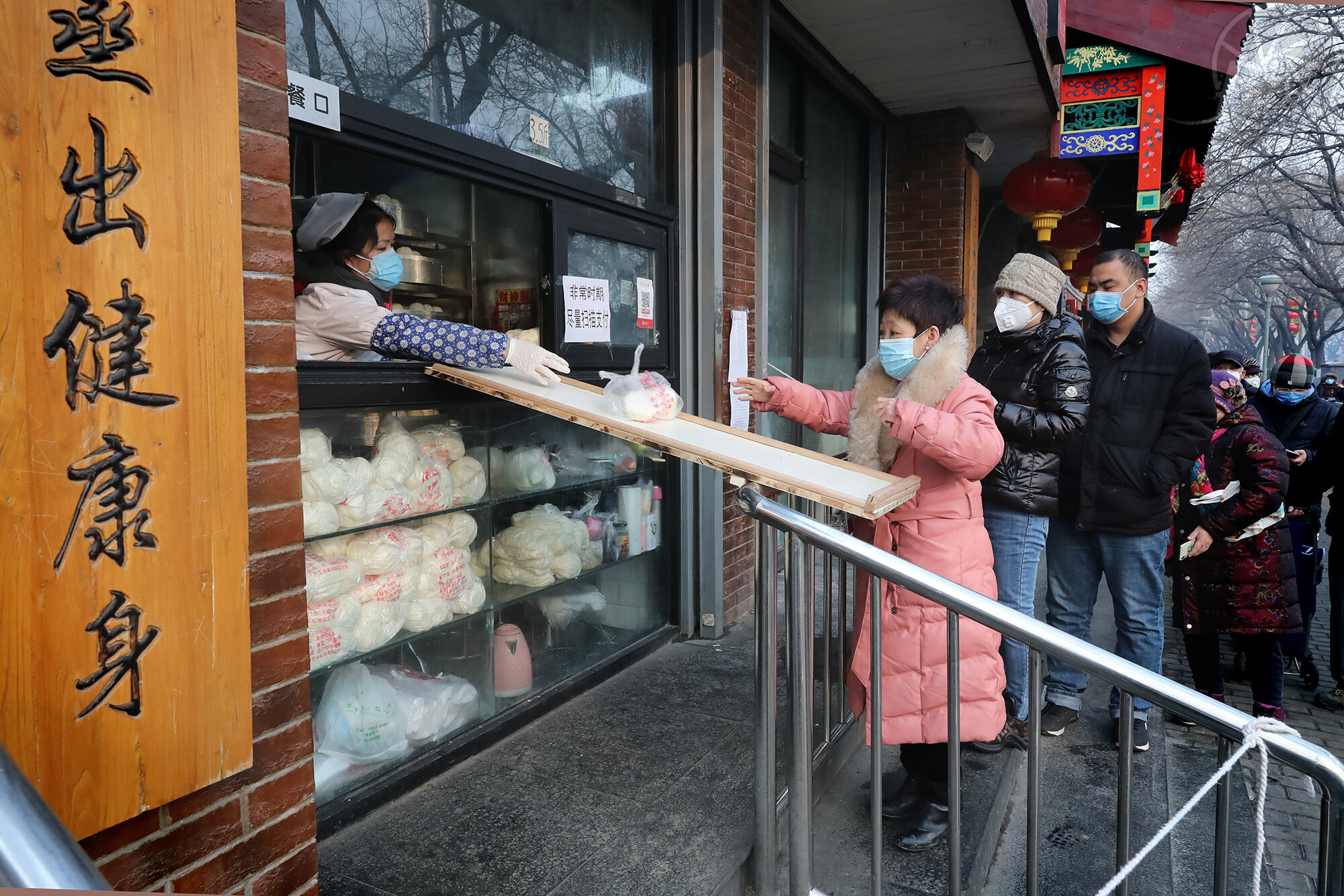 街では生活するためのあの手、この手。人気の饅頭も板に滑らせ提供するソーシャルディスタンス。