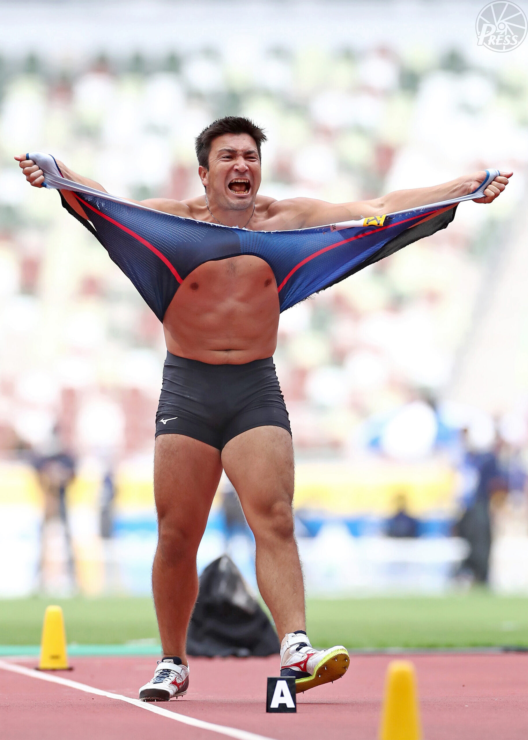 国立競技場で開催されたセイコーゴールデングランプリ。ディーン元気は男子やり投げの最終6投目で84m05を記録。逆転優勝を決め、喜びのあまりユニフォームを引き裂いて雄叫びをあげた(8月23日 国立競技場)
