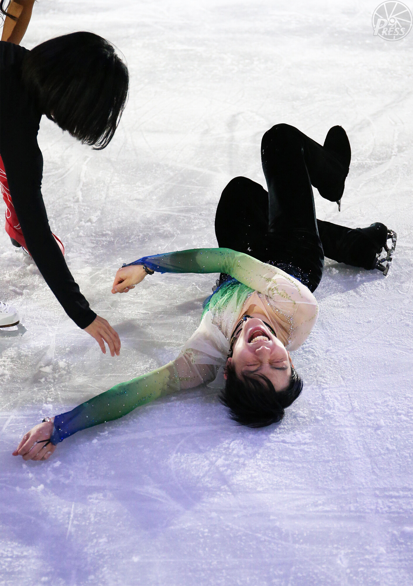 四大陸選手権最終日、エキシビションで転倒しながらも笑顔を見せる羽生結弦(ソウル・木洞アイスリンク 2月9日撮影)