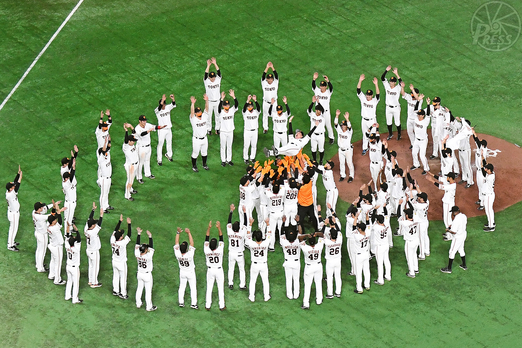 新型コロナウイルスの感染拡大で観客数を制限しながら開催されたプロ野球のペナントレース。幕切れもまた「新しい形」で行われた。マスクと手袋で完全防御した球団スタッフに胴上げされる巨人の原監督。距離を空けて選手たちの歓喜の輪が囲んだ。(東京都文京区・東京ドーム 10月30日)