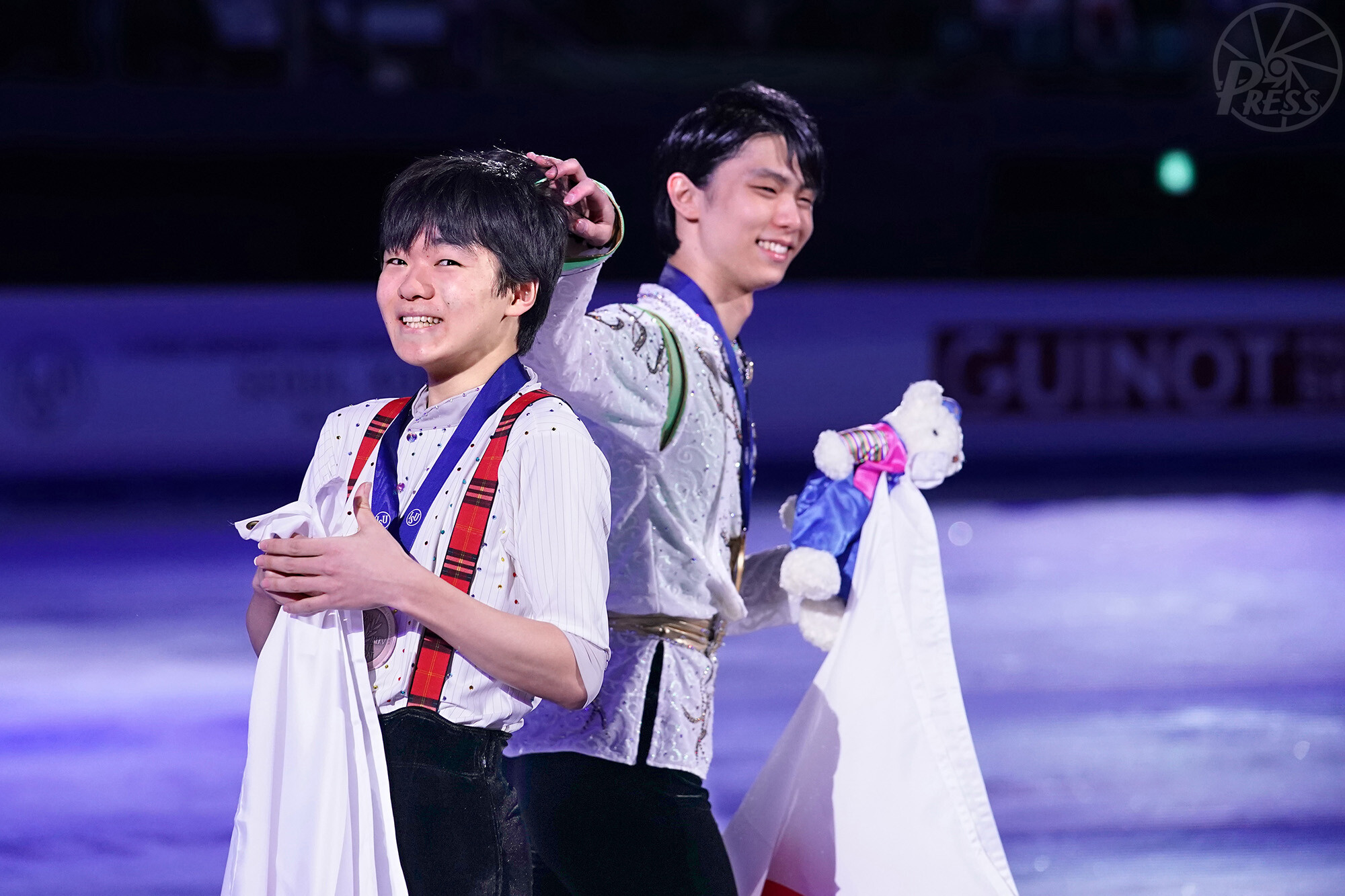 フィギュアスケートの四大陸選手権で、表彰式の後、優勝した羽生結弦選手(右)に頭をなでられ笑顔を見せる鍵山優真選手(韓国・ソウル 2月9日)