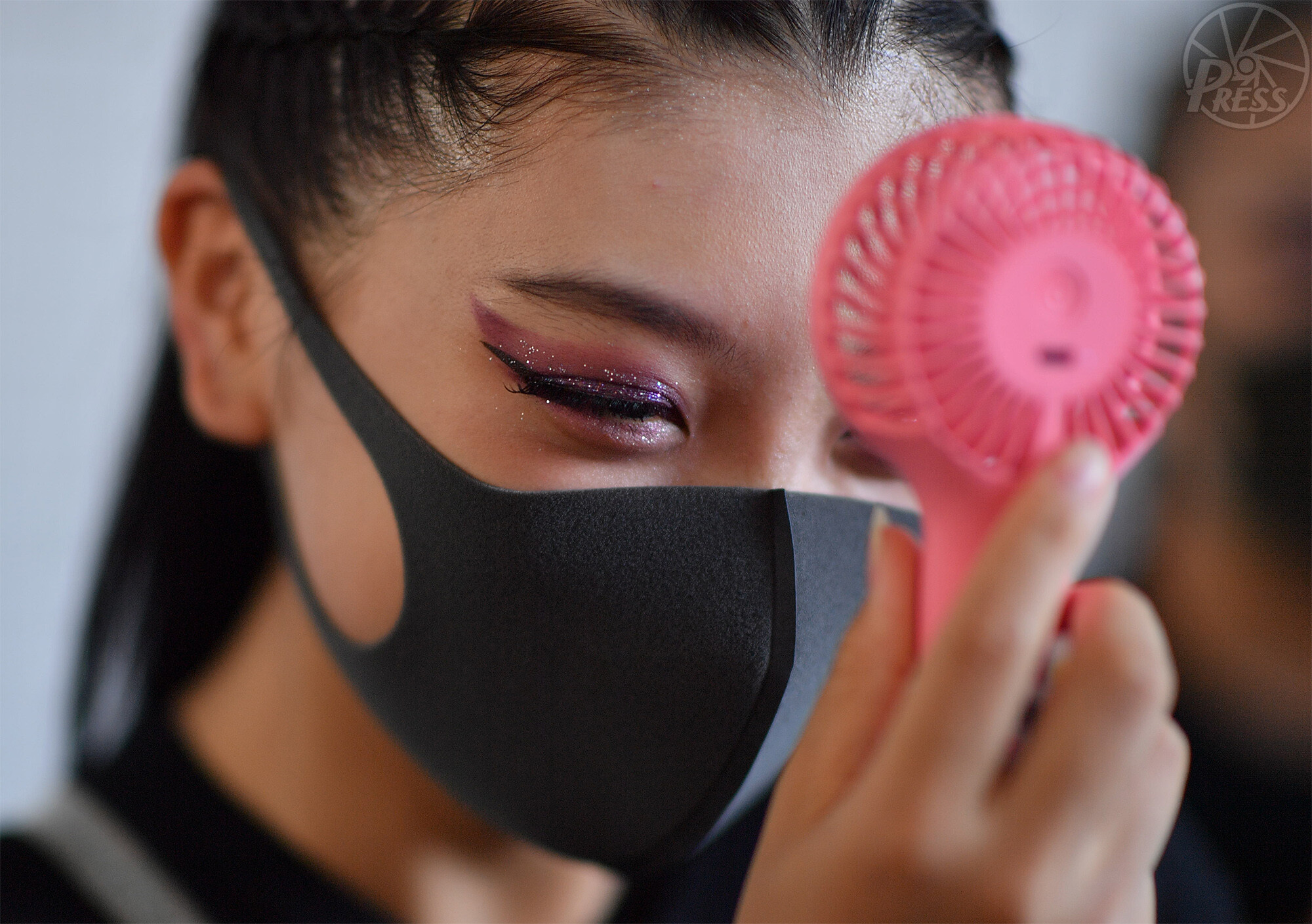 暑さ対策のため小型扇風機を持ち、本番に備える日体大桜華(東京)の生徒