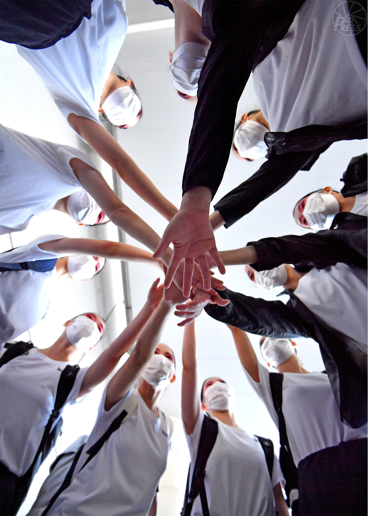 プール学院(大阪)は、マスク姿にエアタッチで円陣を組んだ(8月18日)