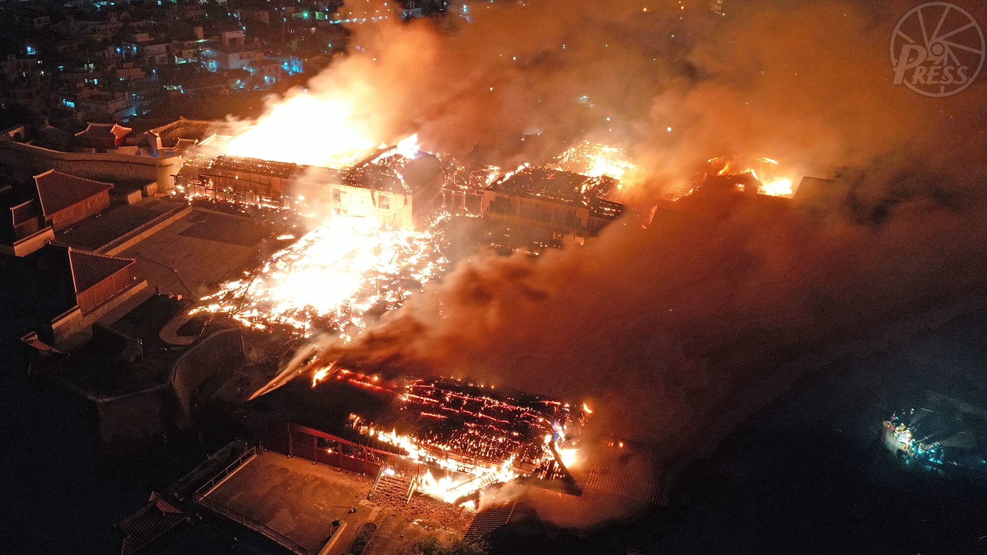 焼け落ちた首里城正殿(中央)。手前の北殿、奥の黃金御殿や書院にも延焼し、激しく煙が上がった(那覇市首里当蔵町・小型無人機で 2019年10月31日)