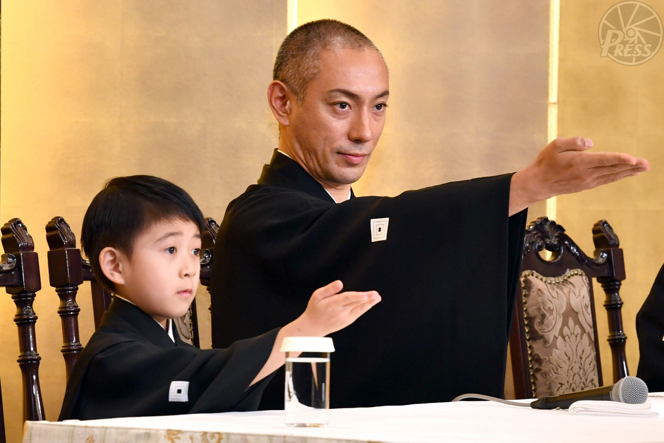 団十郎襲名披露狂言の発表会見で、質問する記者を同じ仕草で指名する市川海老蔵(右)と堀越勸玄くん(東京・丸の内 2月7日)