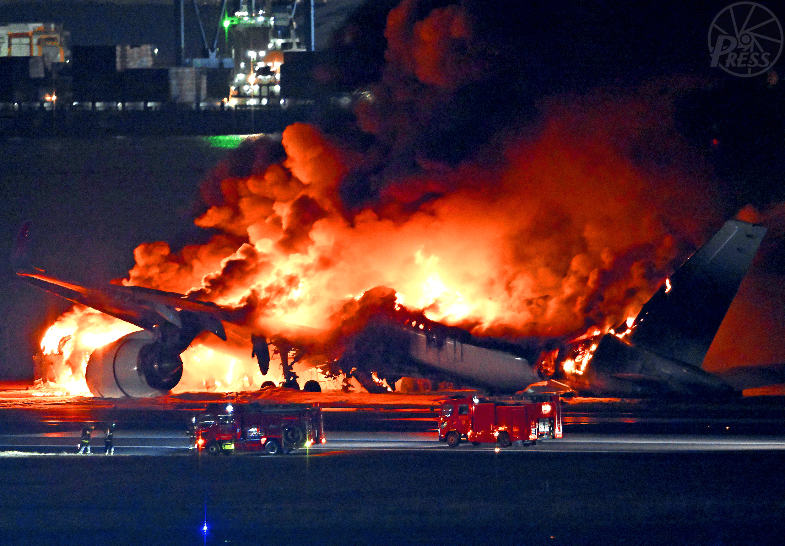 正月2日の羽田空港、滑走路で日本航空機と海上保安庁の航空機が衝突。黒煙が激しく舞い上がり、機体は猛火に包まれた(羽田空港)