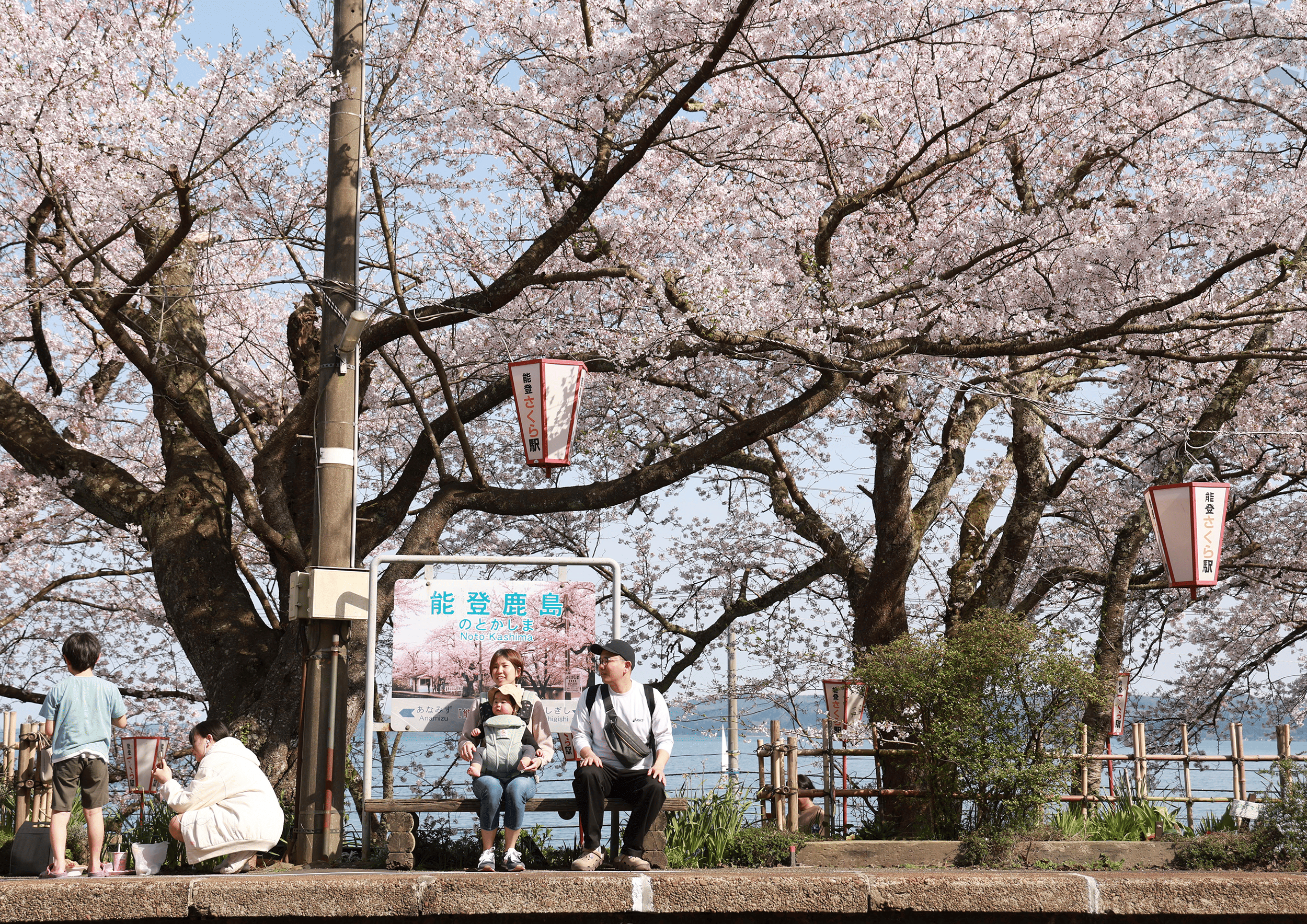 ホームを囲む桜が満開になった「のと鉄道」の能登鹿島駅。元日の能登半島地震で被災し一時運行停止したが、桜の名所として住民に親しまれている(石川県穴水町)=4月13日