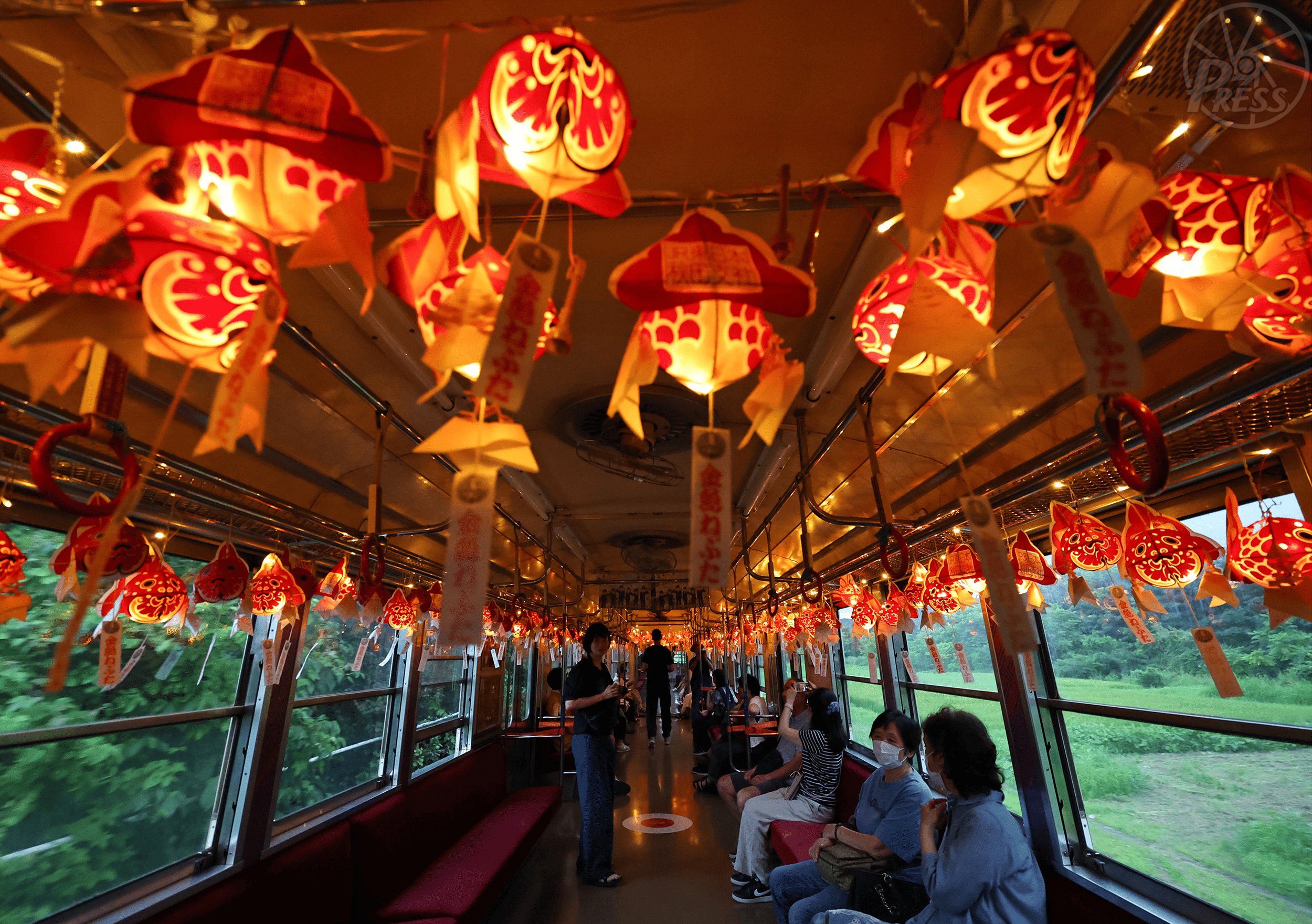 金魚の灯籠が車内を彩る「金魚ねぷた列車」。弘南鉄道・大鰐線で夏に行われ、幻想的な明かりが乗客たちを癒やしていた(青森県)=8月1日