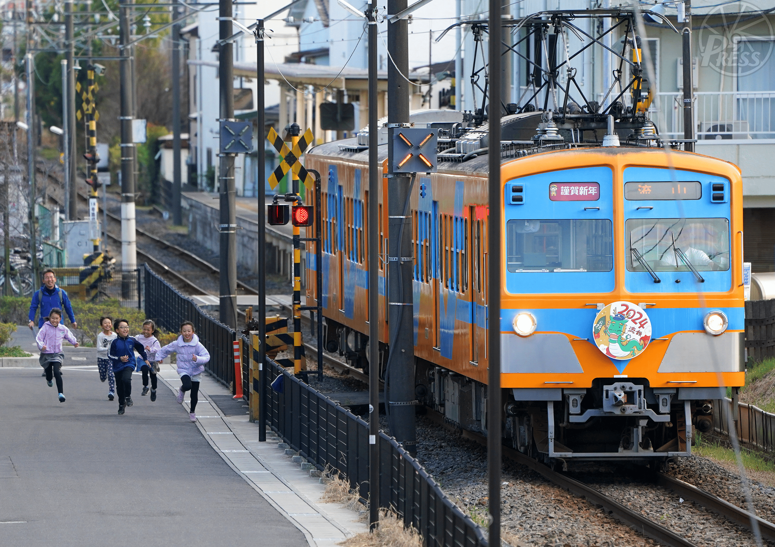住宅街を走る電車と競走する子供たち。流鉄流山線は総距離5.7キロと短いが、地元に密着し多くの人に愛されている(千葉県流山市)=2023年12月27日