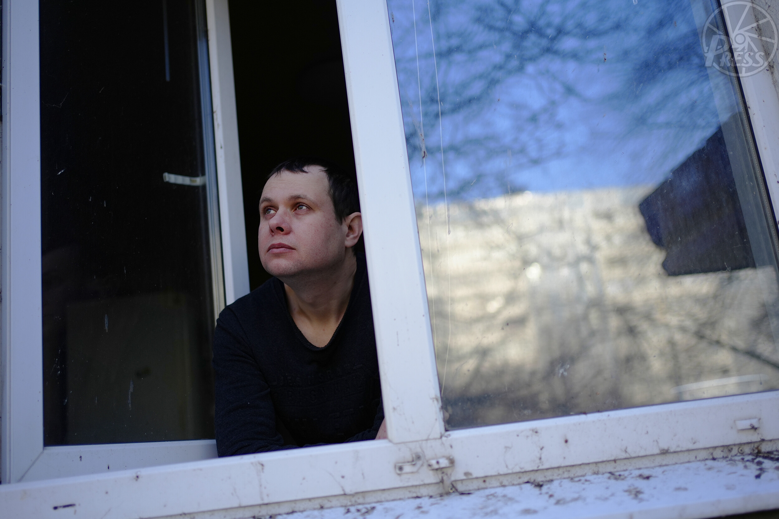 自宅の窓から外を眺める父ビクトルさん。「戦争で何もかも変わった」(ウクライナ・ザポロジエ)=2月2日