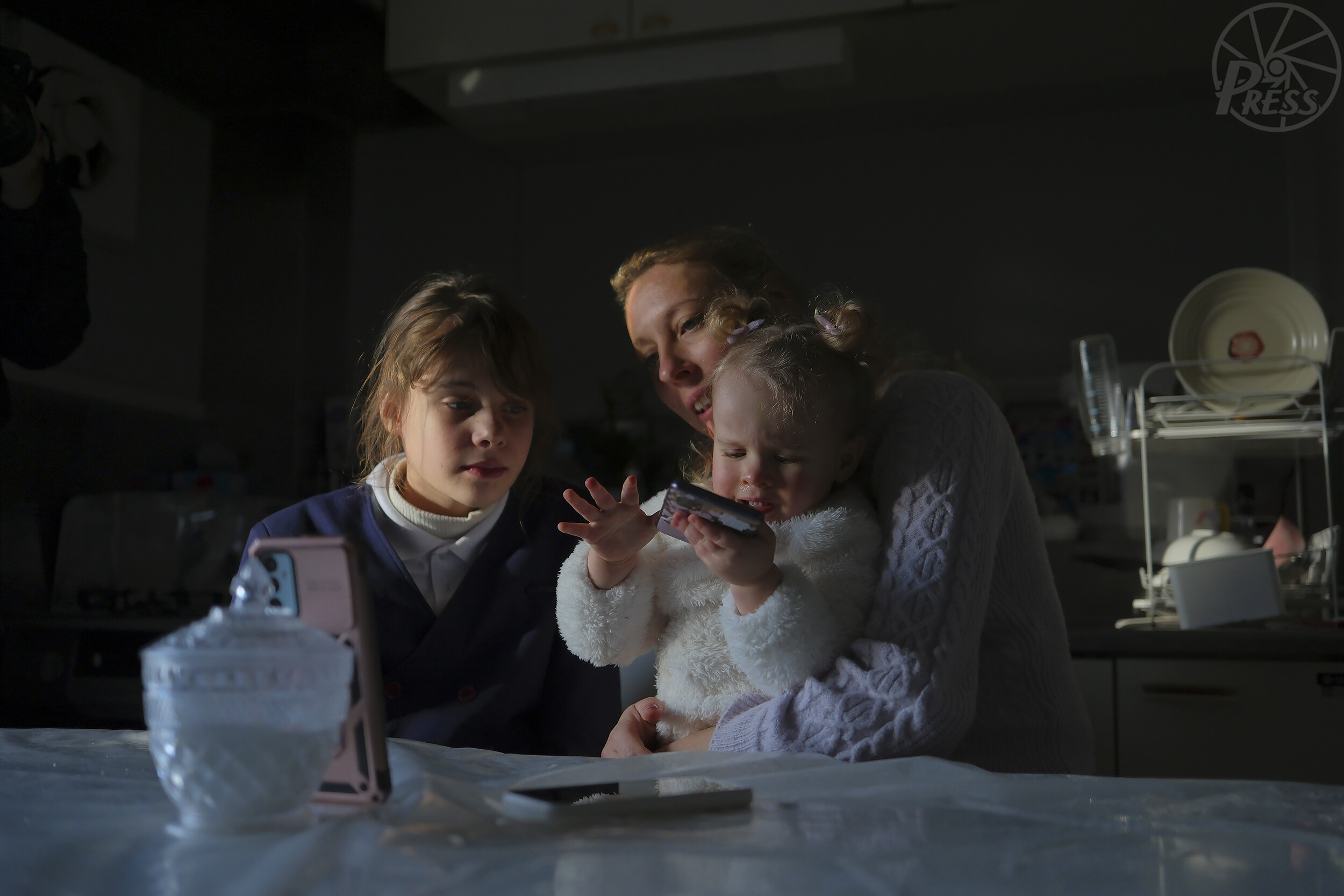 「ほら、パパに顔を見せてあげて」。母アリーナさん(中央)に促され、長女ヤーナさん(左)と次女ズラータちゃんがスマートフォンをのぞき込むと母国に残る父親の声が聞こえてきた。「元気だったかい?」(大阪市)=1月15日