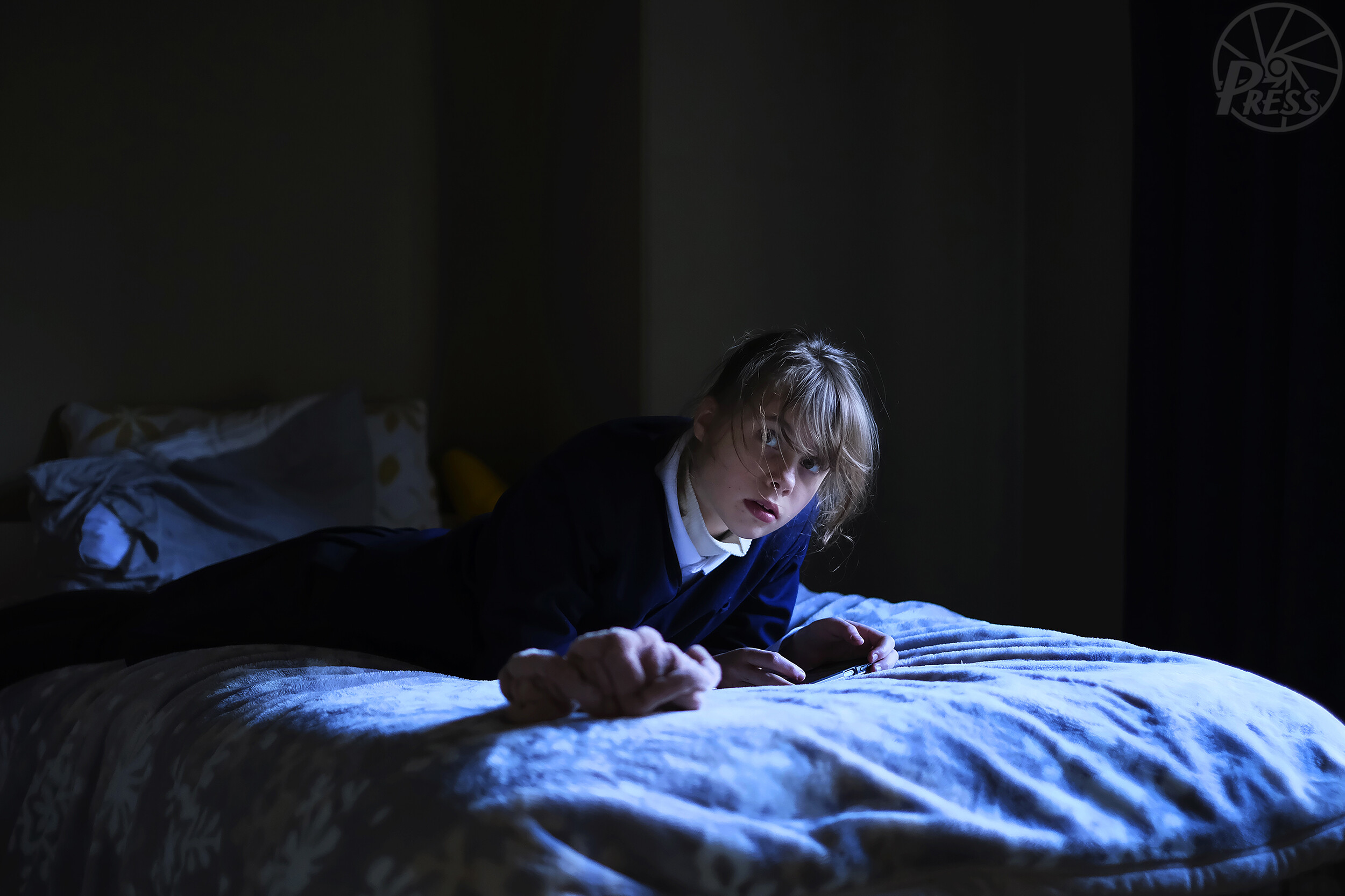 学校から帰宅し、スマートフォンでゲームをする長女のヤーナさん。「ここではどこにも行けない。友達はここにはいないから」。無表情にそう語り、ベッドに寝転んだ(大阪市)=1月15日