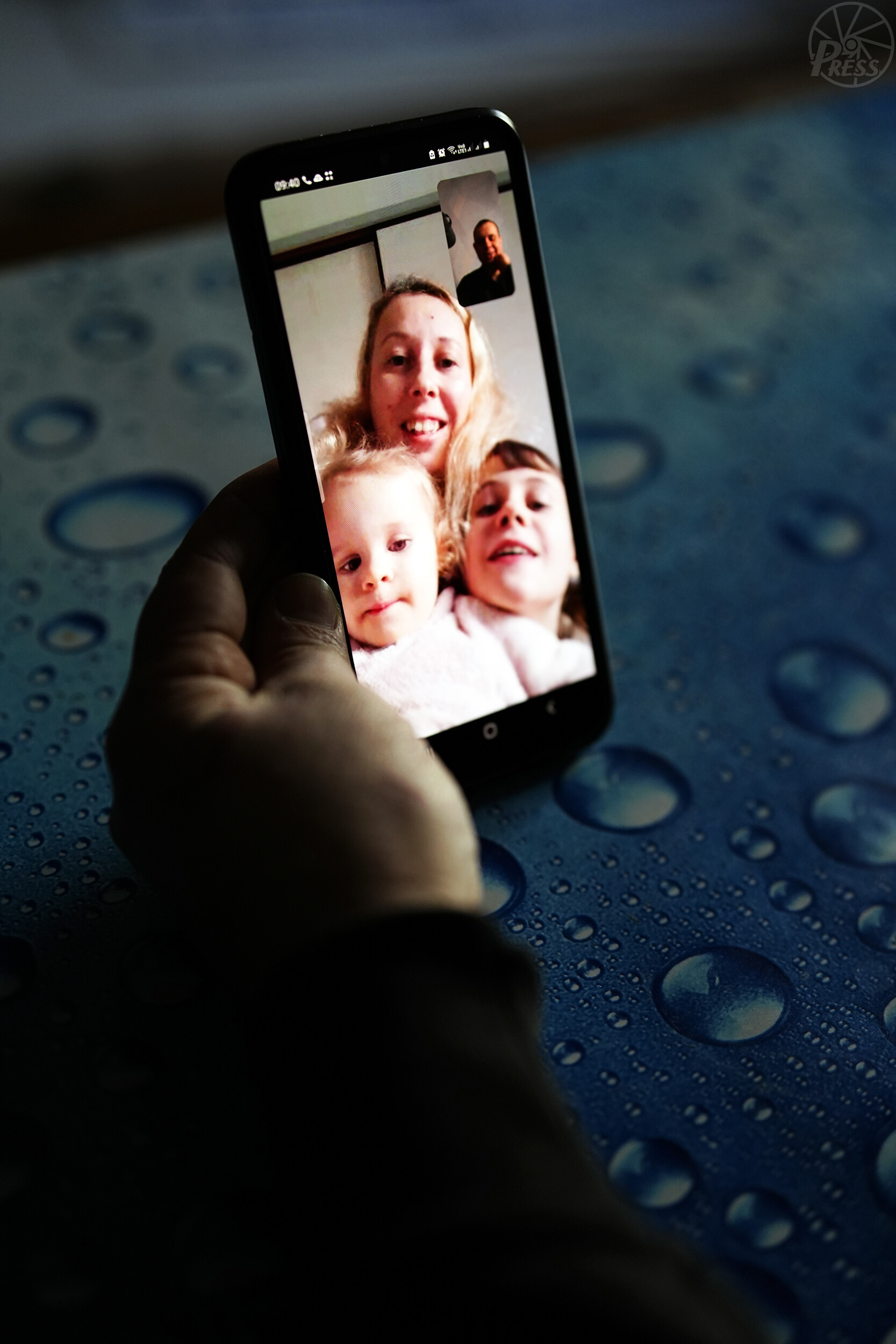 日本に避難した家族とビデオ通話する父ビクトルさんのスマートフォン画面。(左から)次女ズラータちゃん、母アリーナさん、長女ヤーナさん(ウクライナ・ザポロジエ)=2月2日