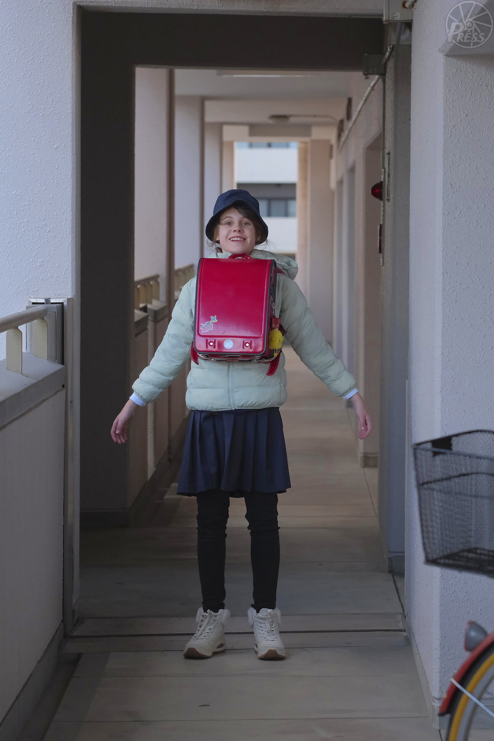 下校時、カメラに向かっておどける長女ヤーナさん(大阪市)=1月15日