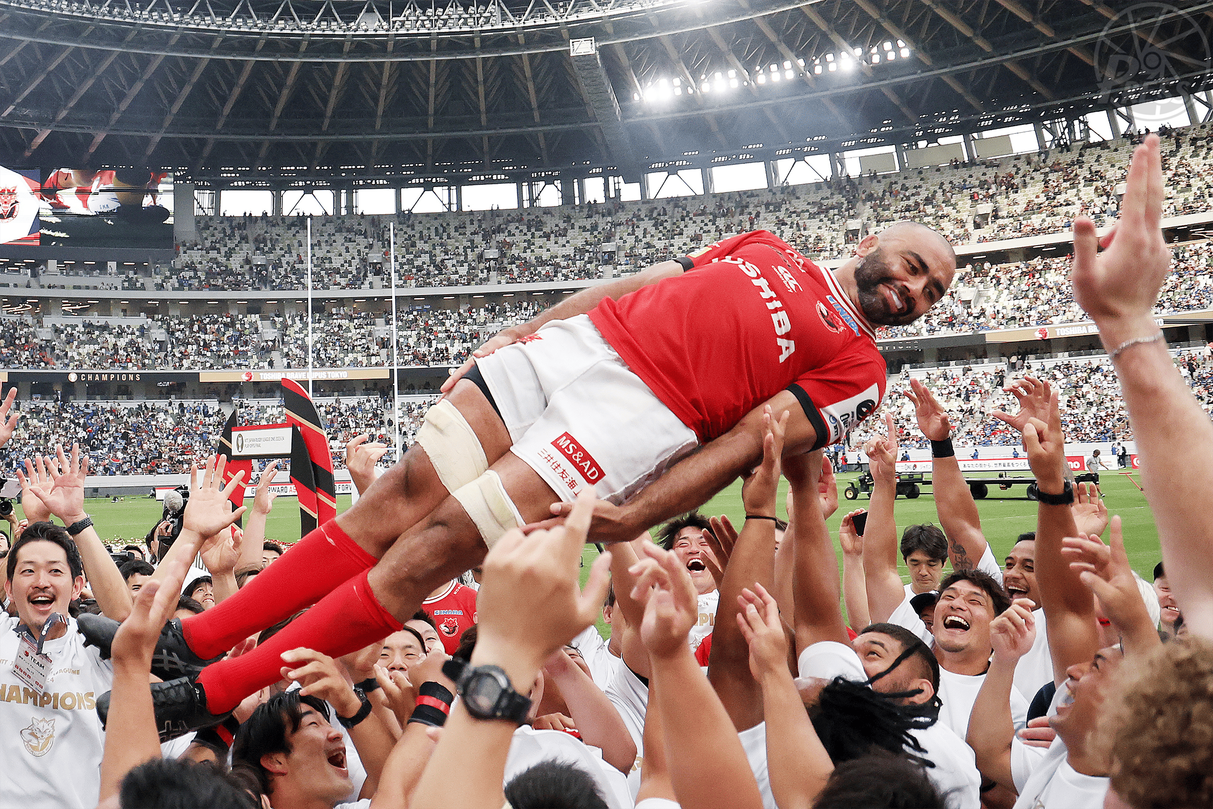 ラグビーリーグワンでBL東京が初優勝を果たし、「棒立ち」状態で胴上げされるリーチマイケル主将(国立競技場)