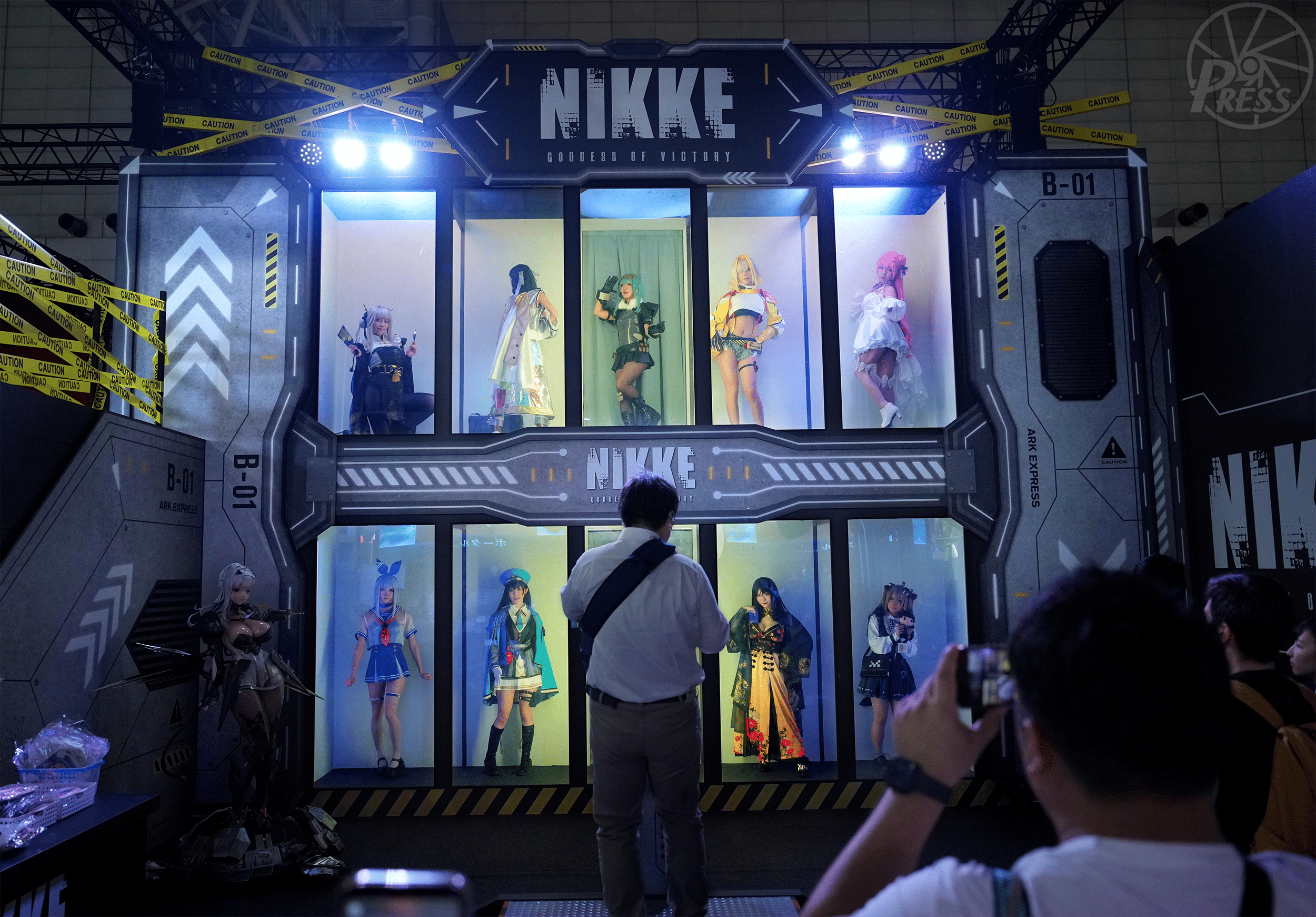 人気ゲーム「勝利の女神:NIKKE」のガチャを現実に体験できるコーナーが東京ゲームショウで大人気。参加者がボタンを押すとゲームに登場する少女型ヒューマノイドにふんしたコスプレーヤーがボックス内に登場する。人形を持っているコスプレーヤーを的中させると限定グッズがもらえる(幕張メッセ)