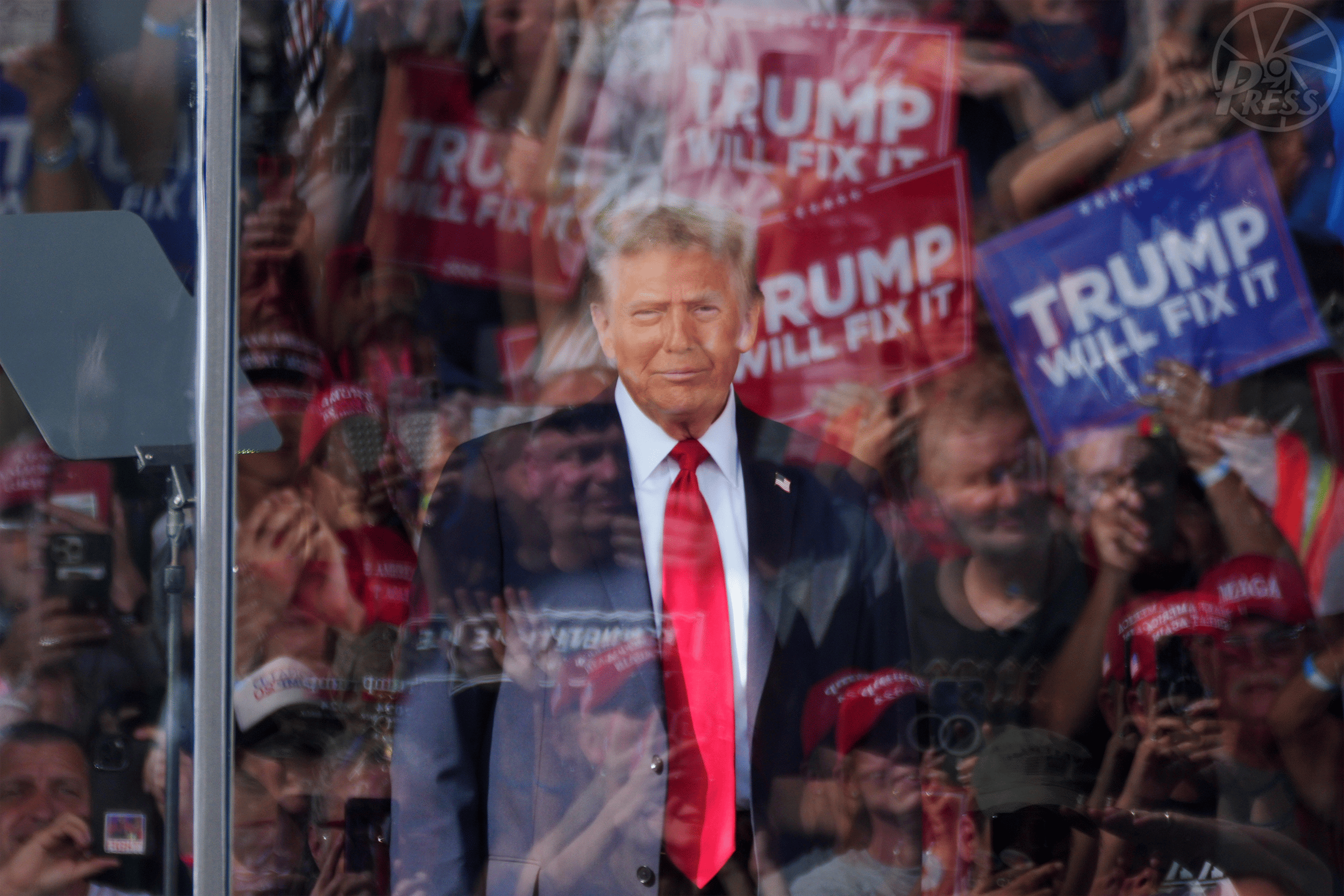 演説集会に臨む共和党のトランプ前大統領。支持者からの熱狂的な声援を受けた。民主党のハリス副大統領と接戦を繰り広げ、5日の投開票を前に激戦州を精力的に回った。6日には、勝利宣言の演説を行った(米国・ノースカロライナ州ガストニア)