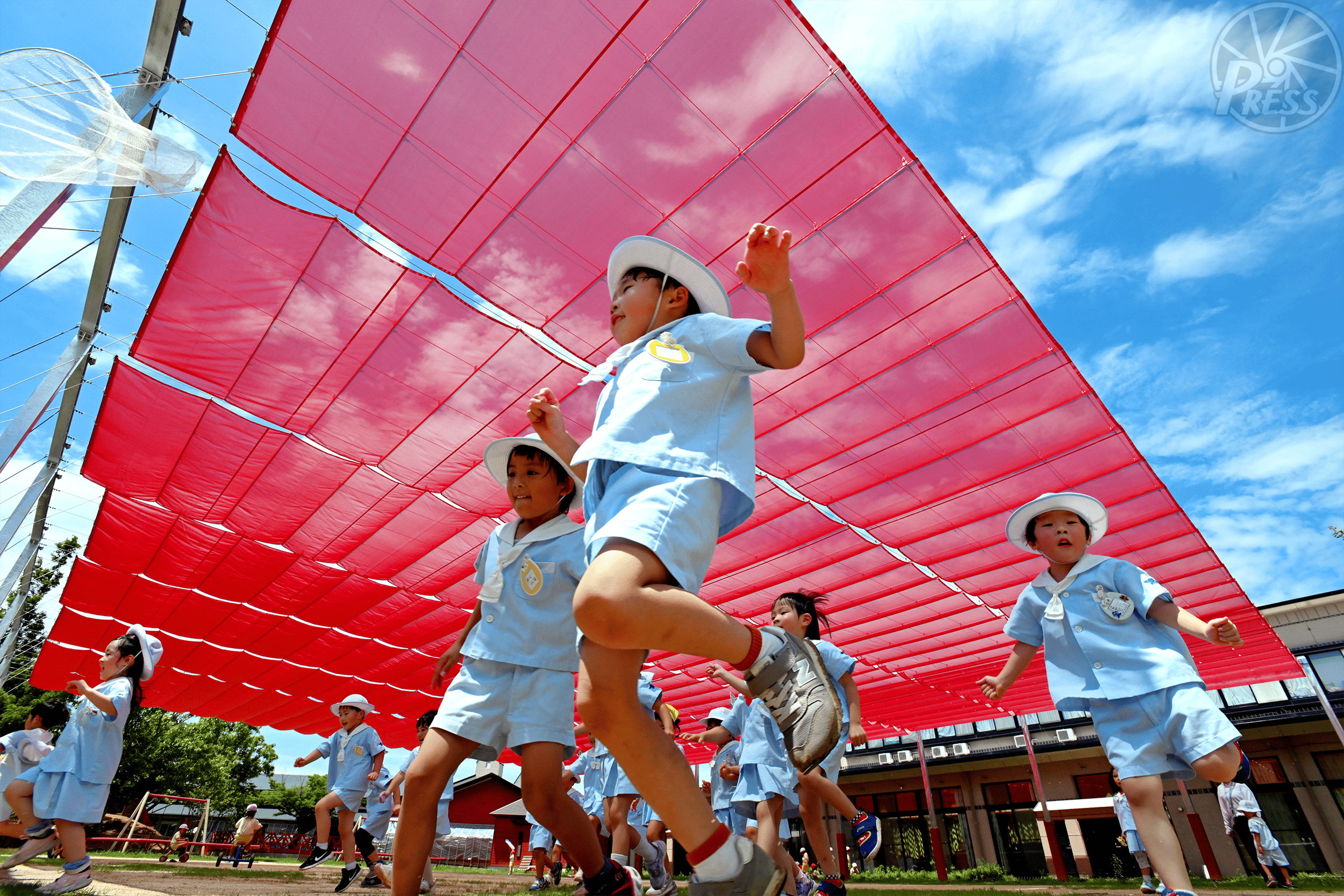 「メガ・サンシェード」の下、のびのびと園庭で遊ぶ園児たち(福岡県宗像市)=7月3日