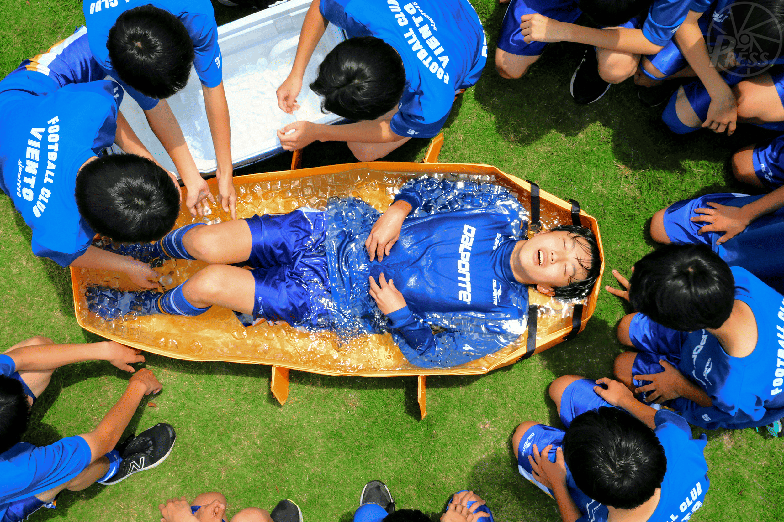 アイスバス「P-PEC」の使用感を試すサッカークラブの中学生(富山市)=6月29日