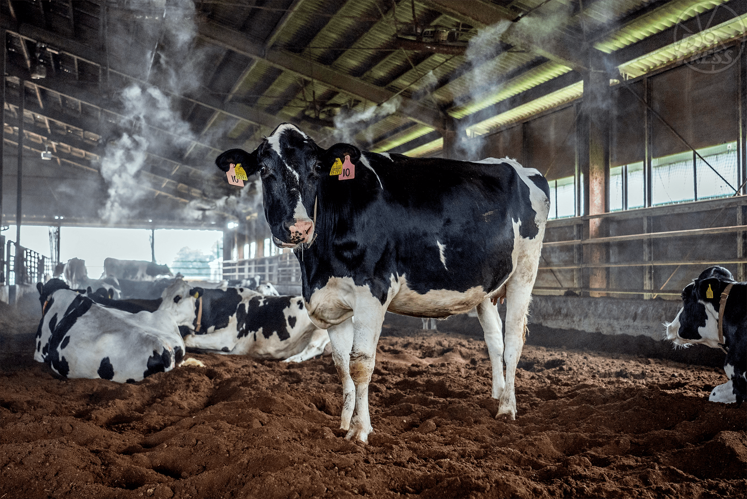霧が発生する牛舎で飼育される牛(三重県四日市市)=7月3日
