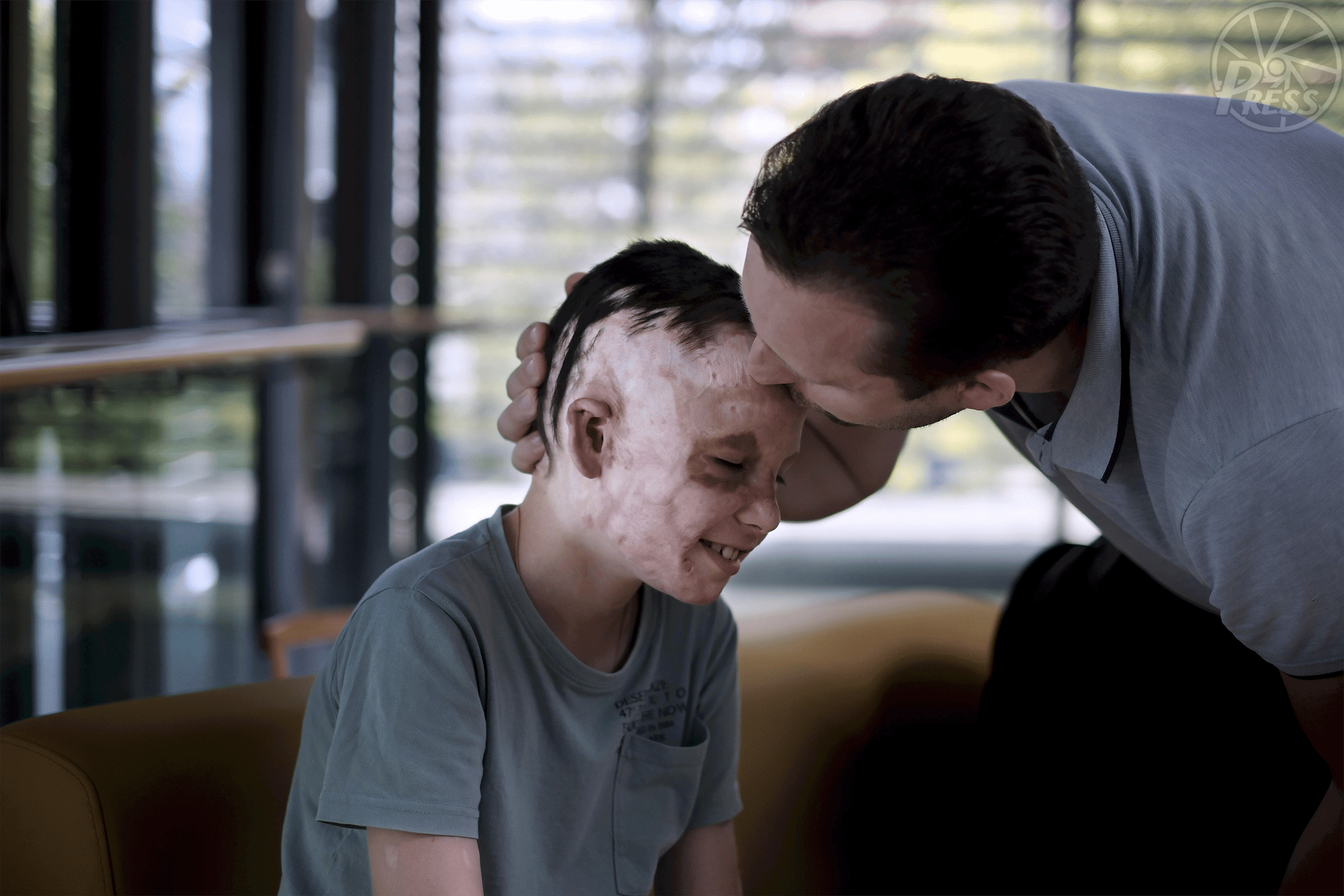 ロシア軍のミサイル攻撃で全身に重度のやけどを負った9歳のロマン・オレクシフくん。やけどは体の表面の4割に及び、ドイツに搬送されて約30回の手術を行った。 病院で父親にキスをされ笑顔をみせていた。ミサイル攻撃の際に一緒にいた母親は死亡した(ドイツ・ドレスデン) =7月23日