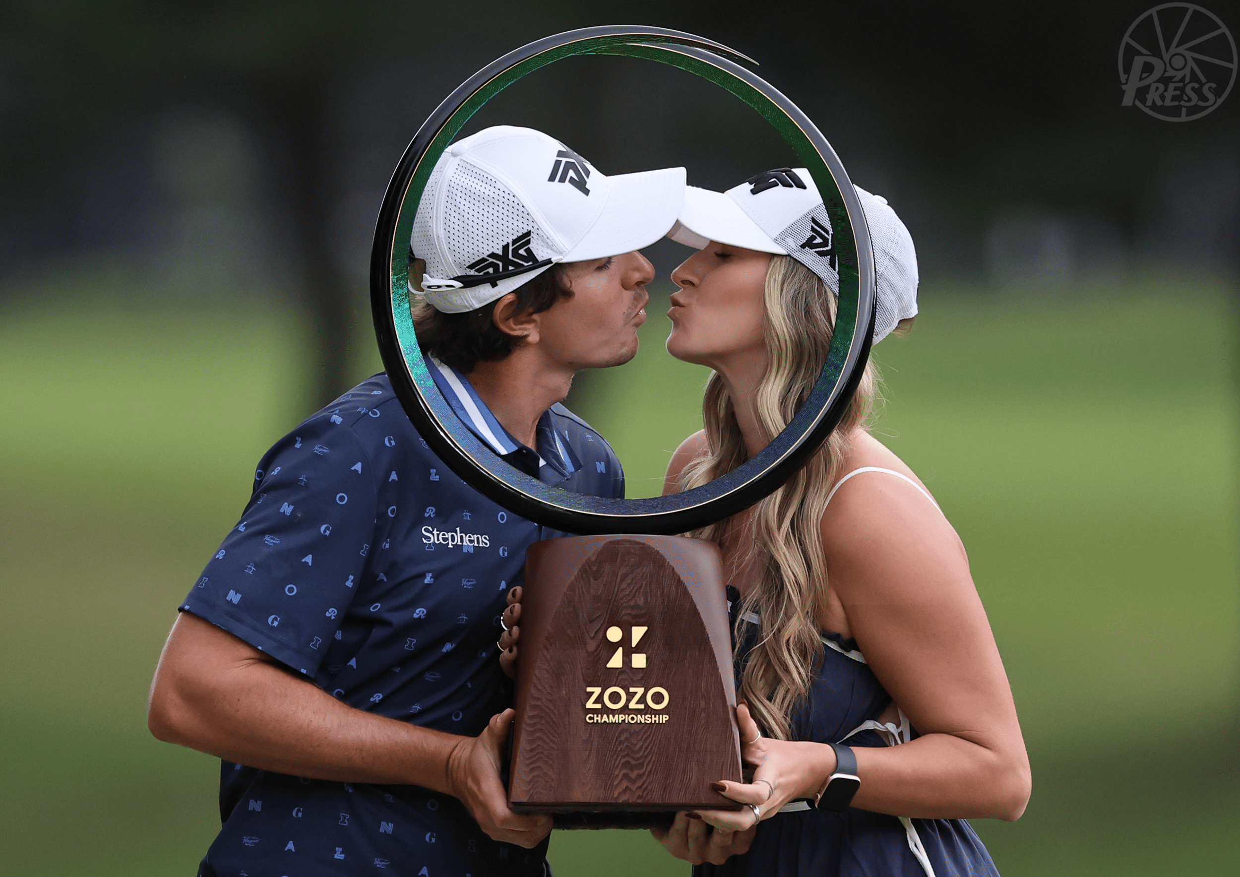 ゴルフの米男子ツアー「ZOZOチャンピオンシップ」で優勝し、表彰式でトロフィーを手に恋人とキスするニコラス・エチャバリア(左)(千葉県・アコーディアG習志野CC)