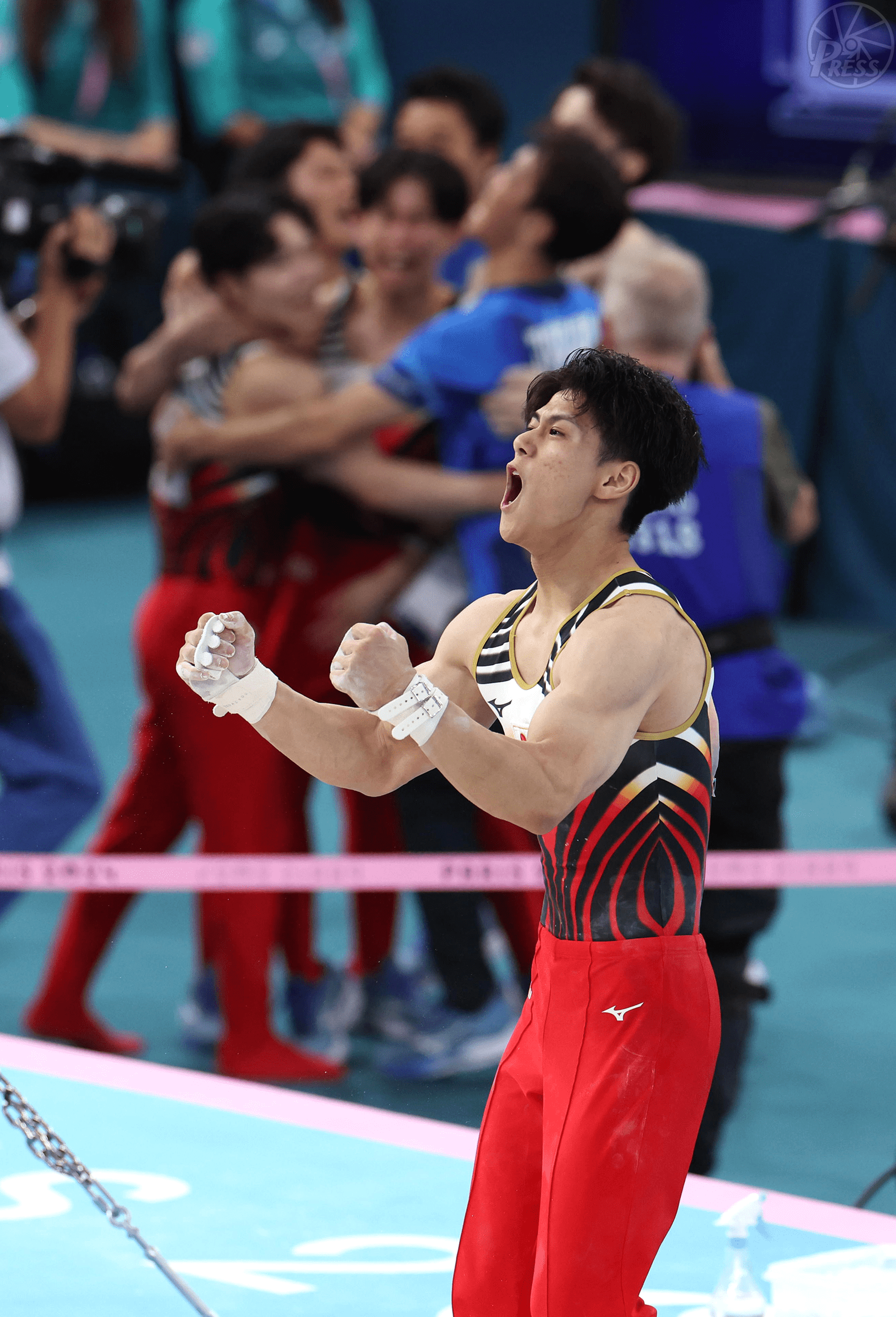 パリ五輪の体操男子団体決勝の最終種目となる鉄棒で着地を決め雄叫びを上げた橋本大輝。トップの中国を追いかけ続けた仲間が歓喜の輪を作った(フランス・パリ)