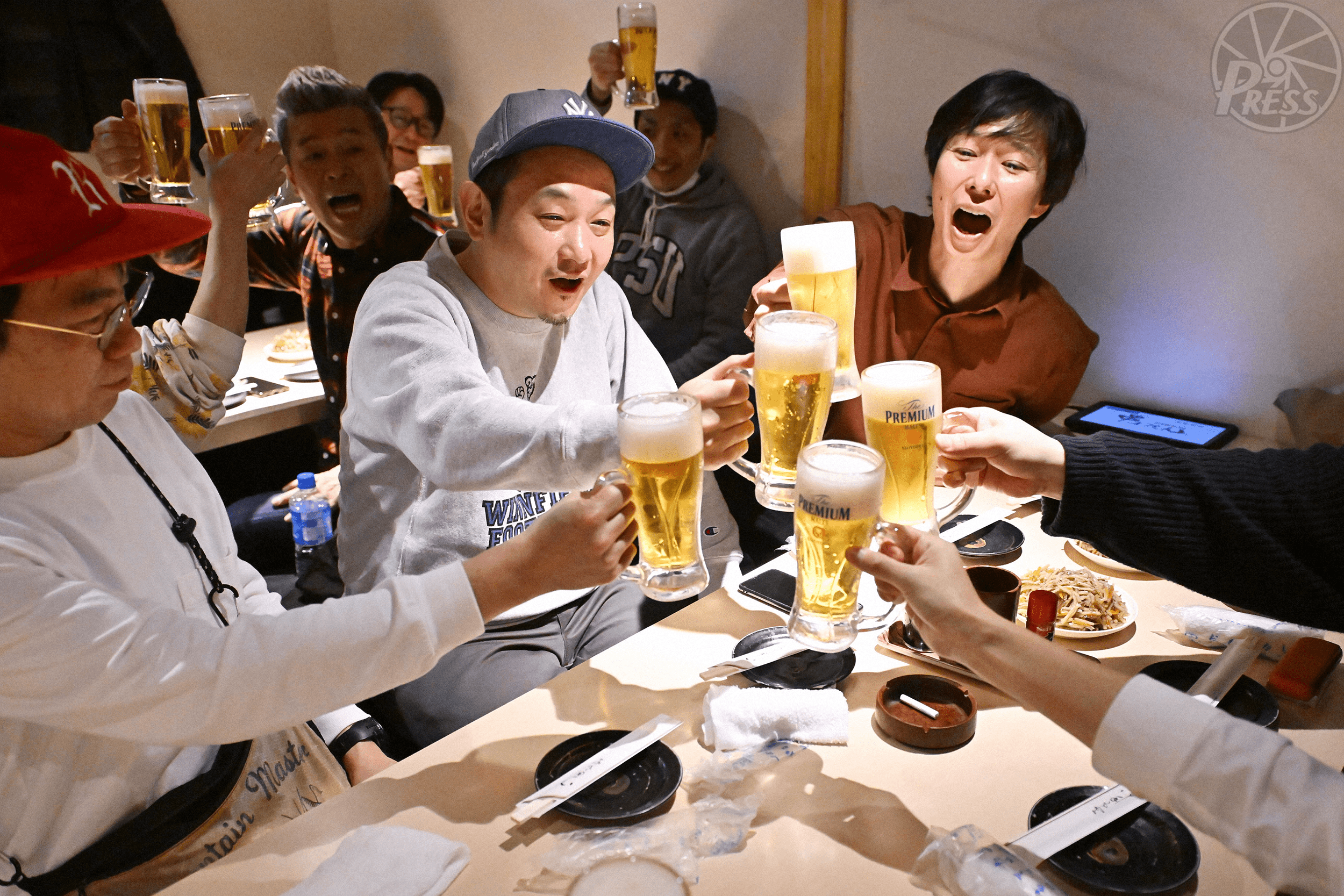 単独ライブの打ち上げで乾杯する滝沢秀一さん(中央右)と西堀亮さん(同左)