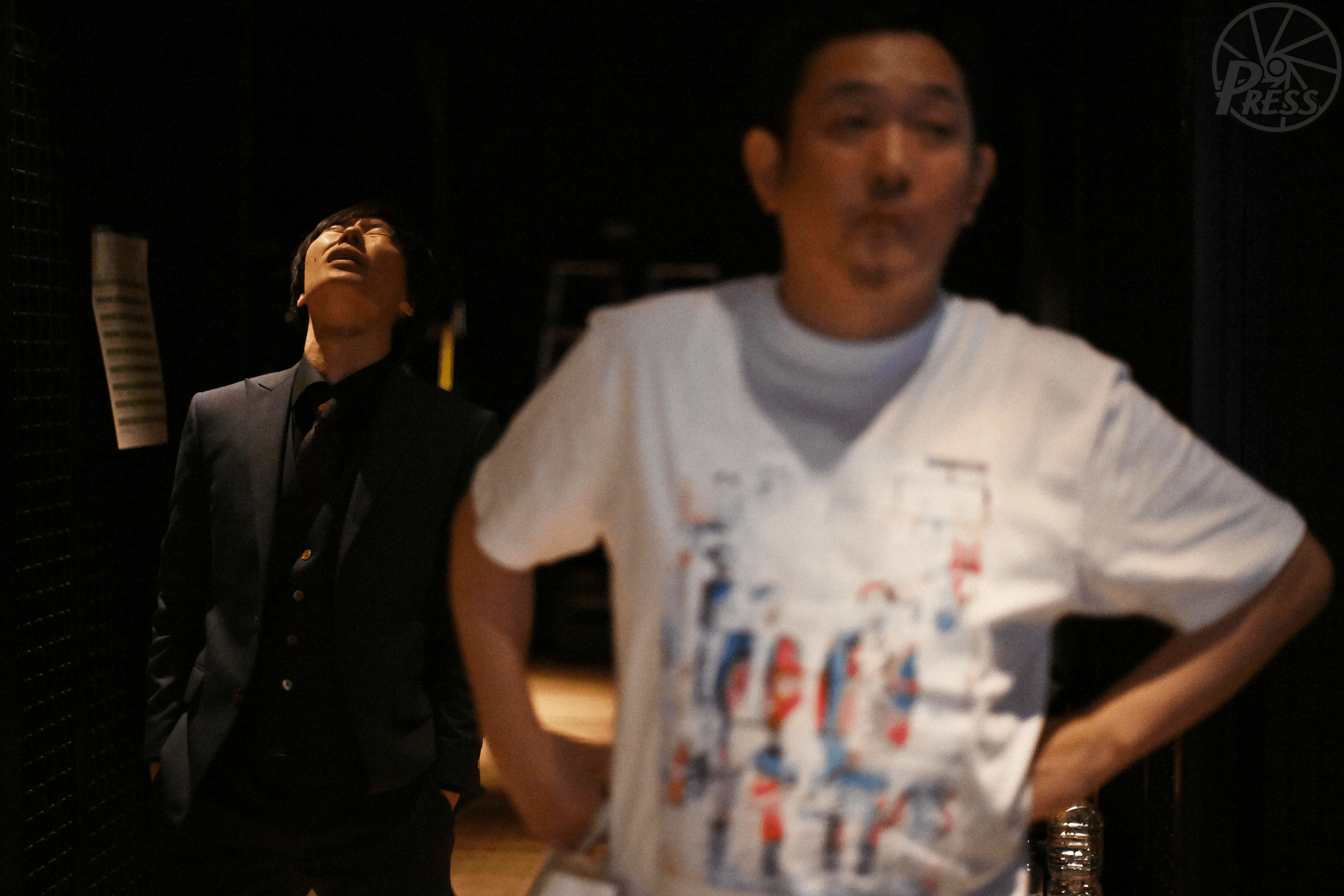単独ライブを終え、天を仰ぐ滝沢秀一さん。右は西堀亮さん(東京都千代田区)